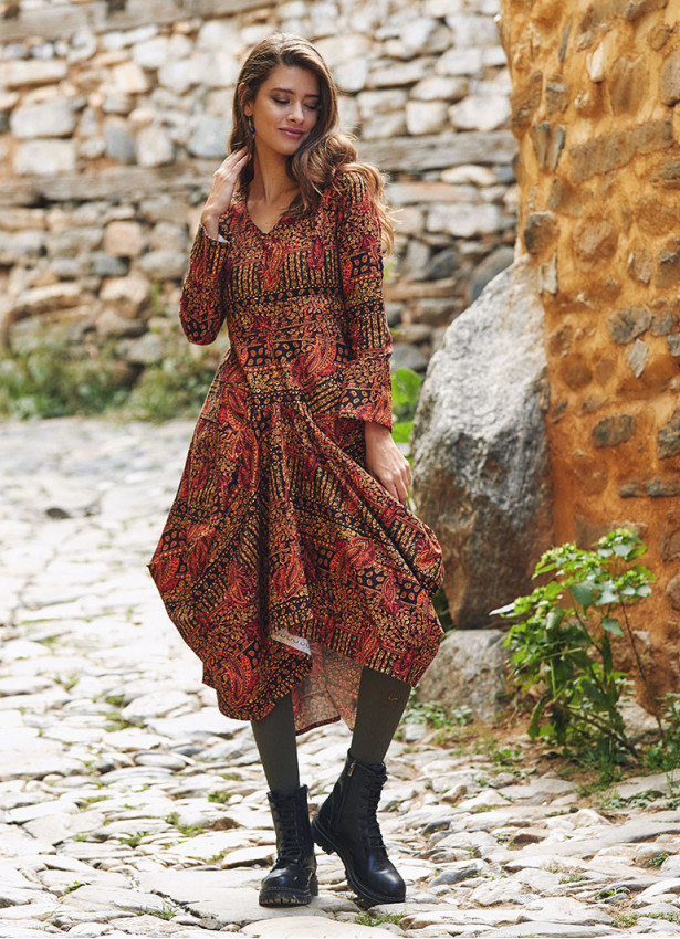 V Neckline, Asymmetrical Hem, Tie Waist, Long Sleeve Boho Dress