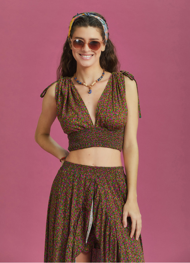 100% woven viscose. It is a fabric woven from natural cellulose obtained from beech trees. It is very light and flowy. It does not contain polyester and does not make you sweat. You can wash it in the washing machine at 30 degrees.
