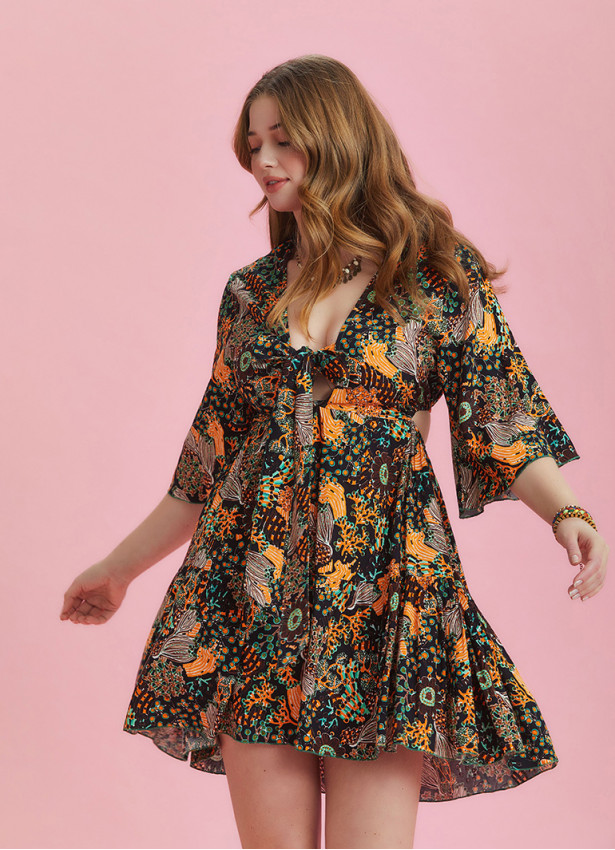 Tie Front V Neckline, Frill Hem, Open Back, Half Sleeve, Short Summer Dress, Plus Size Dress