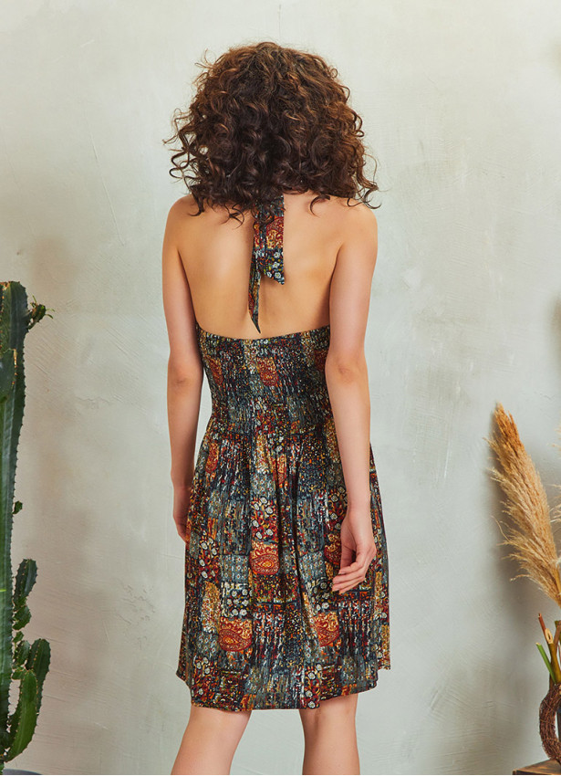 Wrap Tie Neck, Shirred Strech Back, Gathered Waist, Boho Style, Skater Dress