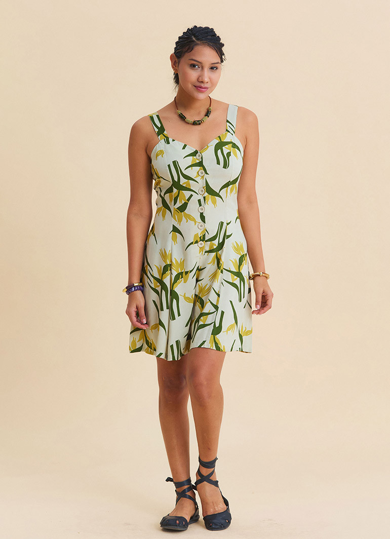 The thin shoulder straps and open back detail enhance its fresh summer appeal, while the front button accents add a stylish and practical touch. Its ethnic-inspired look pairs effortlessly with sandals, woven bags, and natural accessories.