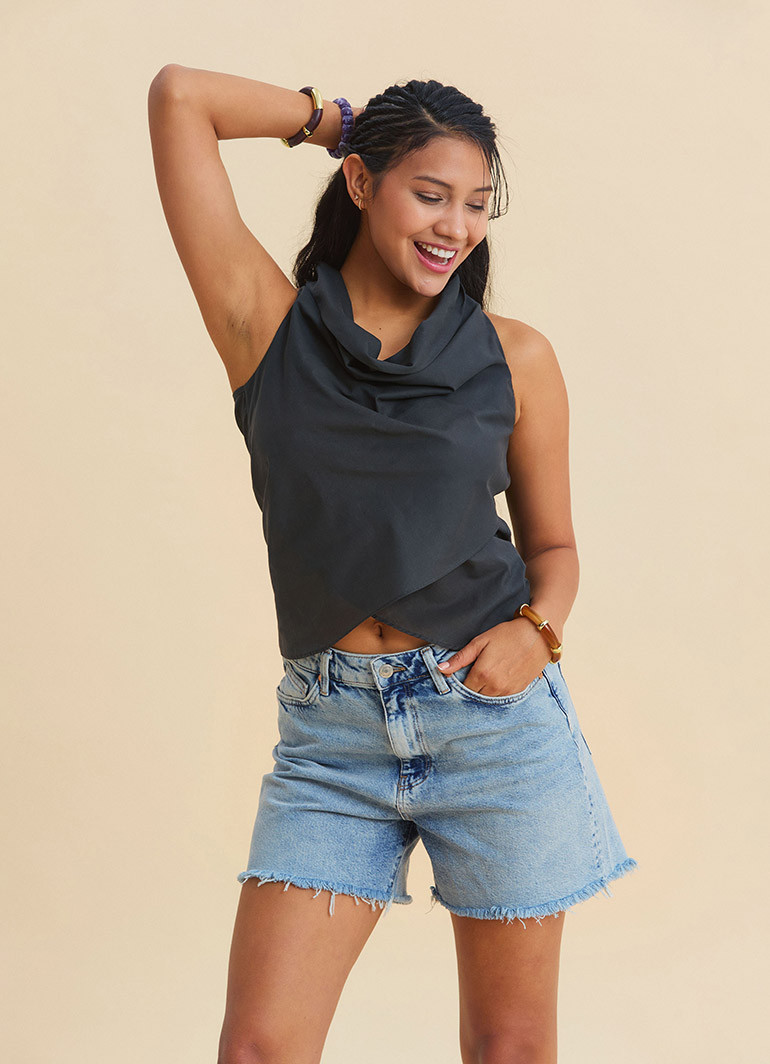 For those who want to add effortless bohemian elegance to their summer outfits: Draped Neck Asymmetric Cut Charcoal Bohemian Blouse 7210 stands out with its flowing draped neckline and asymmetric silhouette that instantly elevates even the simplest looks.