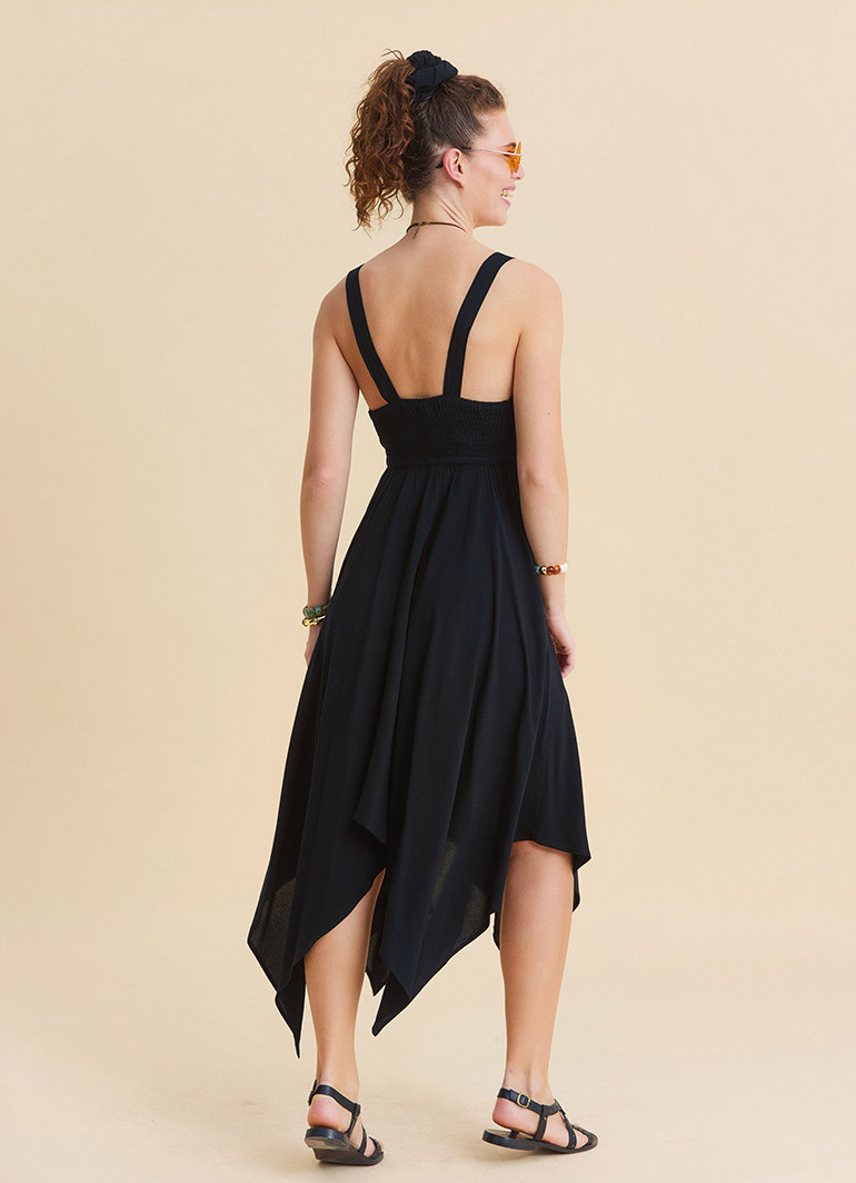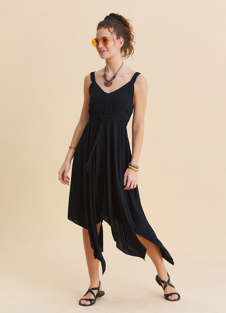 The asymmetrical cut adds a modern movement to the dress, while its bohemian-authentic character makes it stand out whether you are on vacation, in the city, or creating a casual daily look. The elastic waistband gently shapes the silhouette without feeling tight, ensuring a relaxed and comfortable fit.