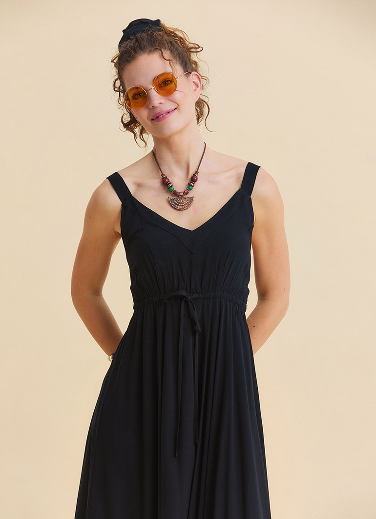If you are looking for effortless elegance and comfort in one piece during hot summer days, the Strappy Elastic Waist Black Summer Dress 7145 offers all-day freshness with its lightweight and flowy structure. Its strappy design highlights the shoulders gracefully, while the timeless black color adapts easily to any style.