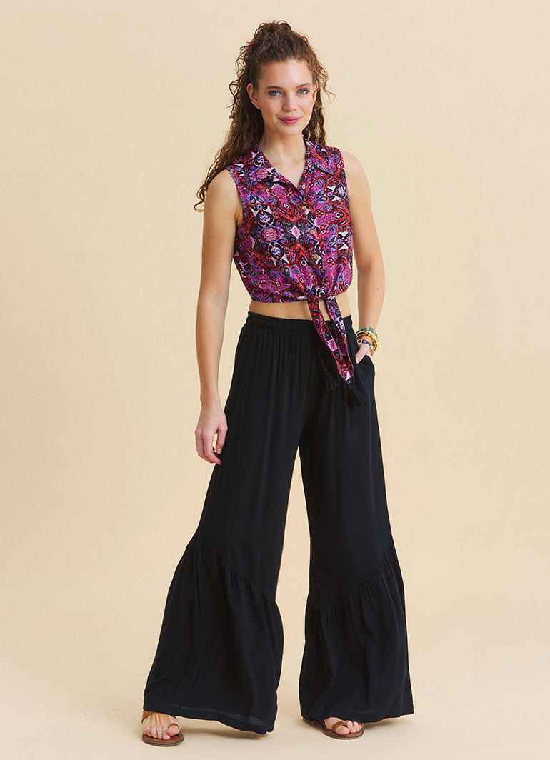 The Elastic Waist Ruffled Pocketed Black Wide-Leg Pants 7190 add effortless comfort and style to your daily outfits with their lightweight and fluid structure. The wide-leg silhouette allows freedom of movement, while the ruffle detail adds a subtle bohemian touch.