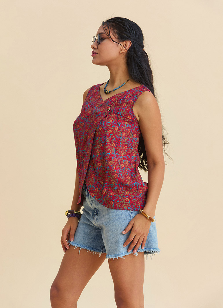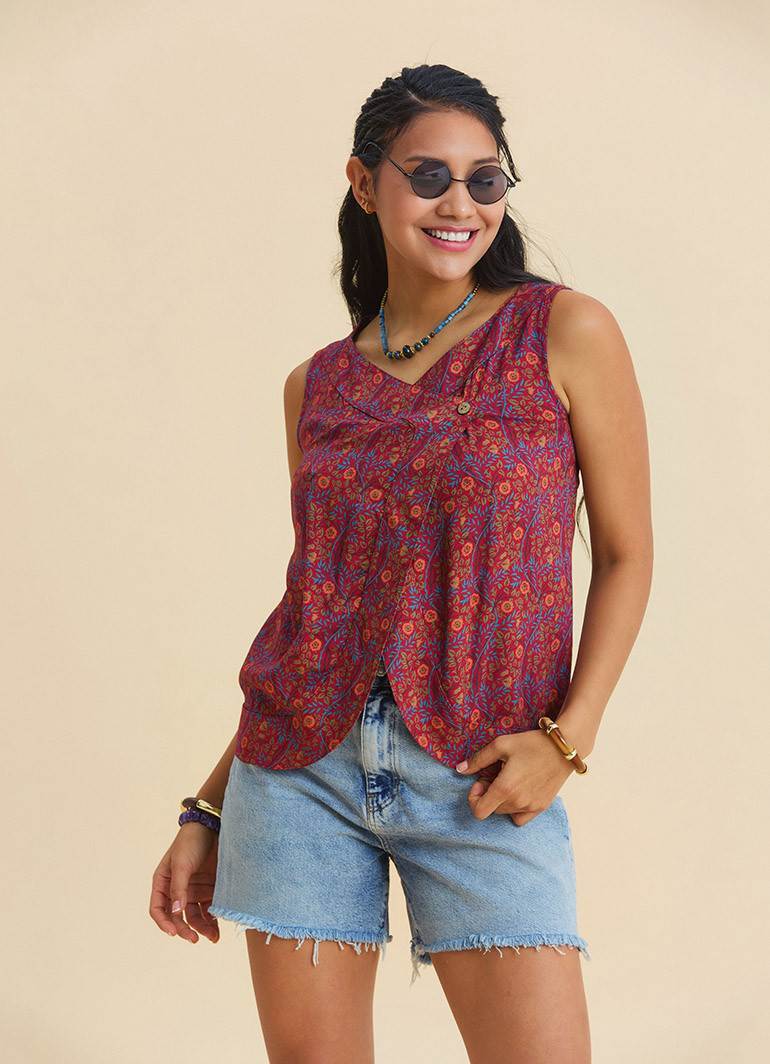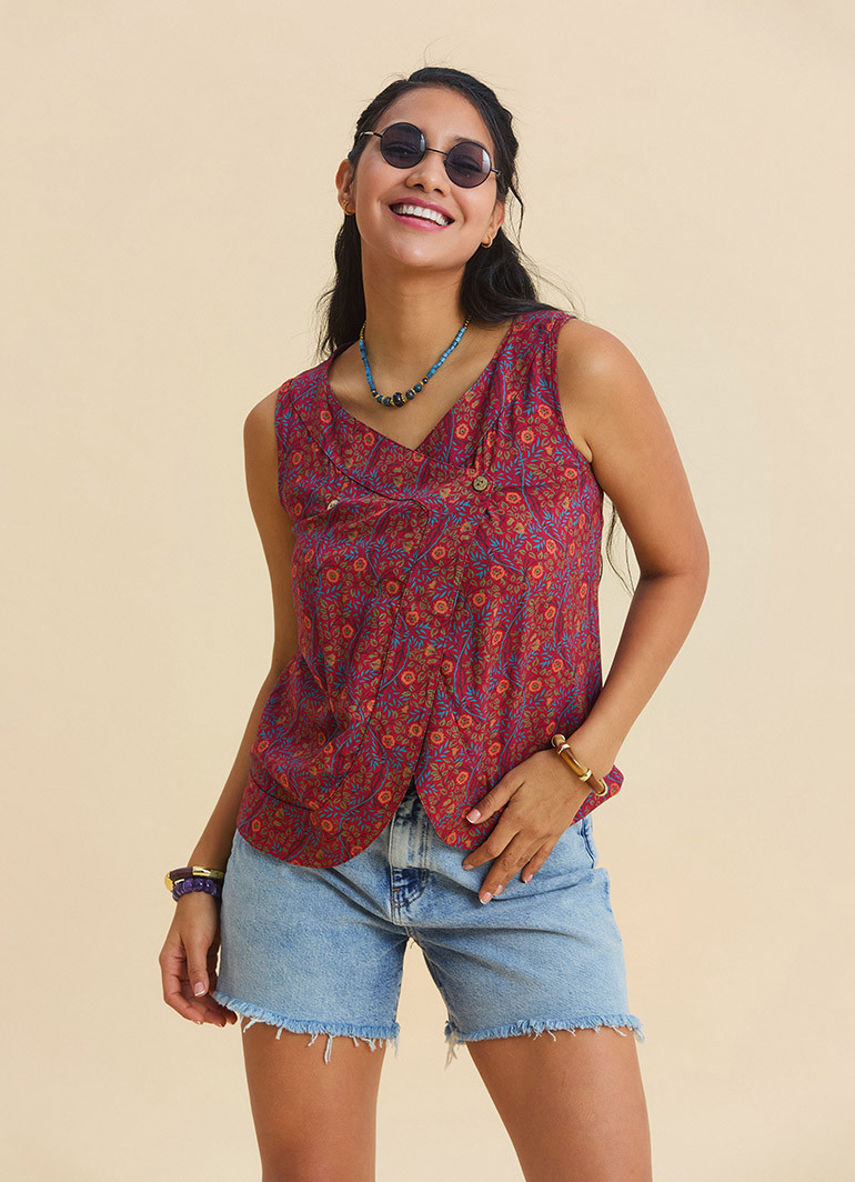 It pairs effortlessly with denim shorts, linen trousers, or high-waisted skirts. If you want to add a bold pattern, relaxed fit, and eye-catching cut to your wardrobe, this blouse is a perfect choice for your summer style.