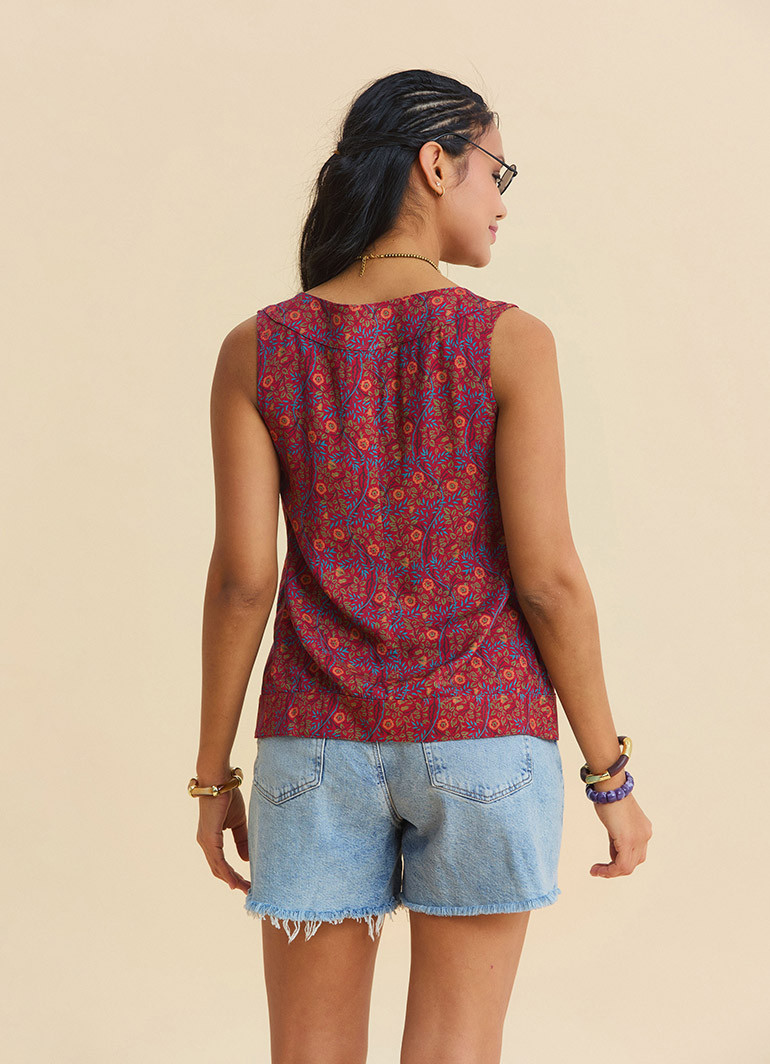 The boat neckline and sleeveless design provide a breezy feel for warm weather, while the wrap-style (envelope) design gently adapts to the body for a comfortable fit. The button details on the front add a distinctive finishing touch to the blouse.