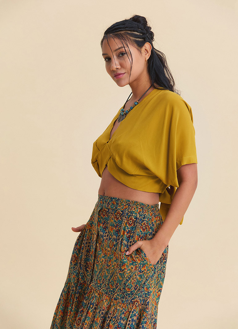Add a vibrant touch to your summer style with this mustard crop blouse featuring a wrap neckline, flowing drape, and an elegant open back detail. Designed to blend bohemian charm with a modern silhouette, it stands out effortlessly in any outfit.