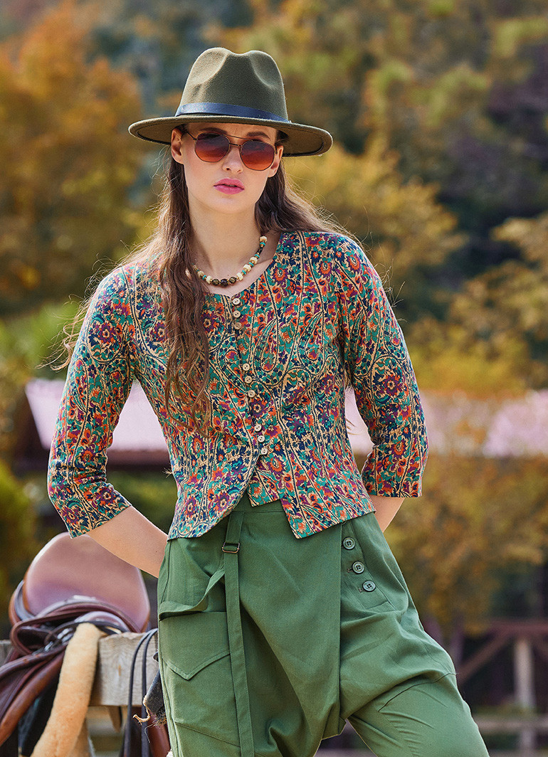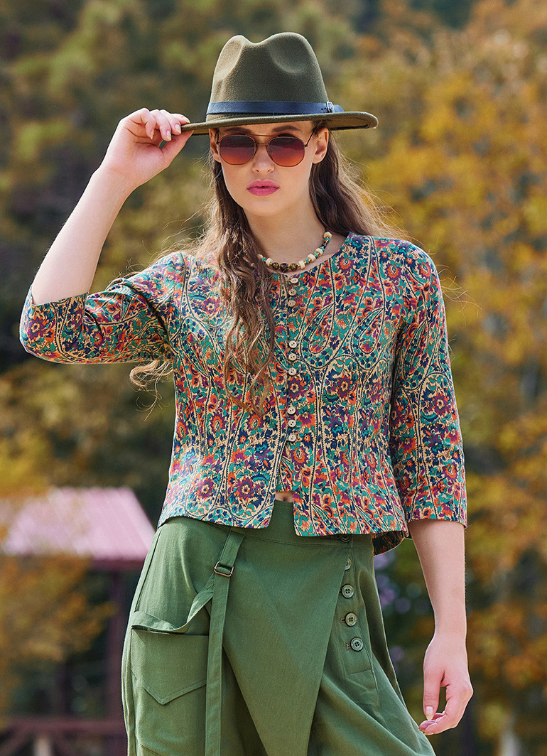 Refresh your seasonal wardrobe with the Crew Neck Half Sleeve Button Detailed Green Floral Blouse (style 4782) — a polished, feminine piece that blends classic tailoring with botanical charm. The green floral print brings a touch of garden-fresh elegance to everyday outfits while the subtle button details add refinement without overwhelming the design.