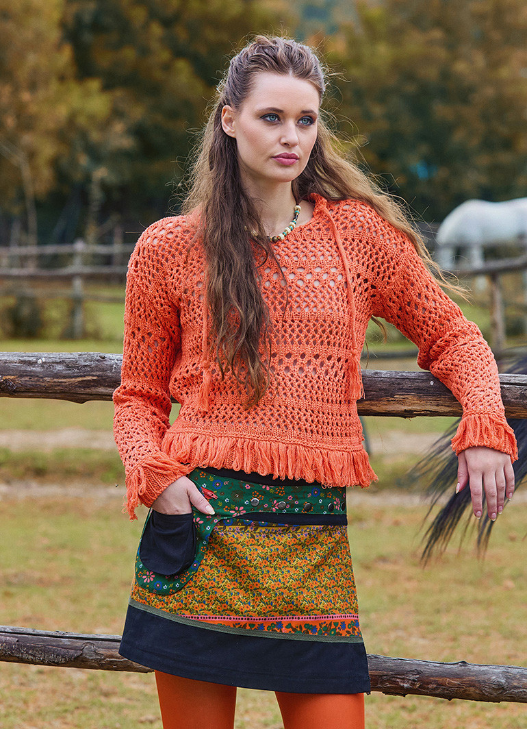 Brighten your winter wardrobe with the Crew Neck Tasseled Orange Winter Blouse 4744 — a cozy, stylish women's knitwear piece that pairs effortless comfort with eye-catching detail. The classic crew neck and openwork knit create a clean, versatile profile while the tasseled trim adds a playful, artisan touch that elevates everyday looks.