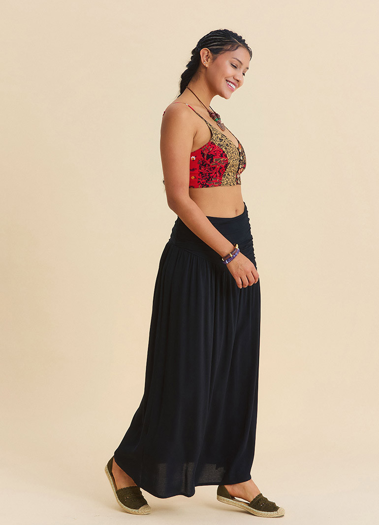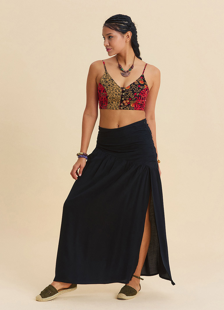 The timeless elegance of black pairs effortlessly with many wardrobe staples. This bohemian maxi skirt can easily be styled with basic tops, crop blouses, shirts, or summer sandals. The slit detail enhances mobility, while the draped design adds a sophisticated and feminine touch.
