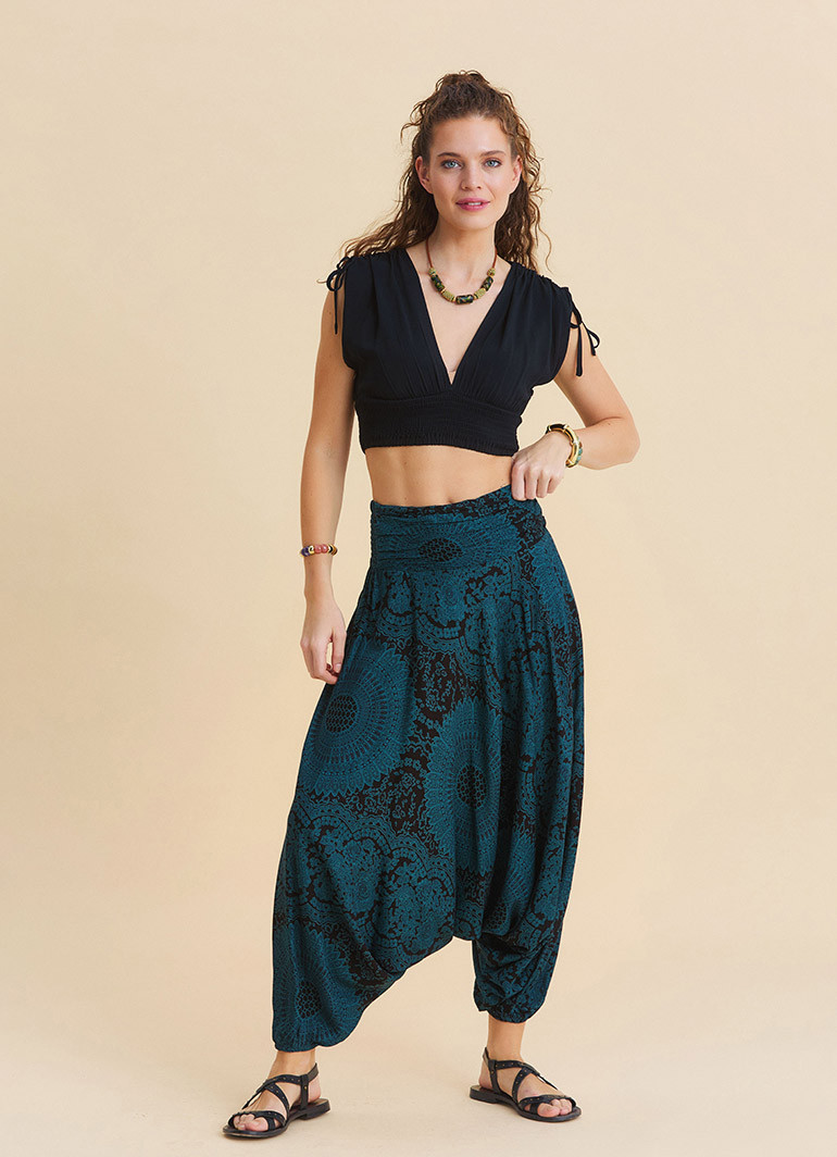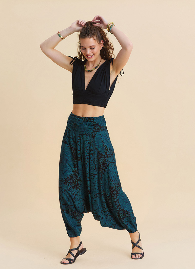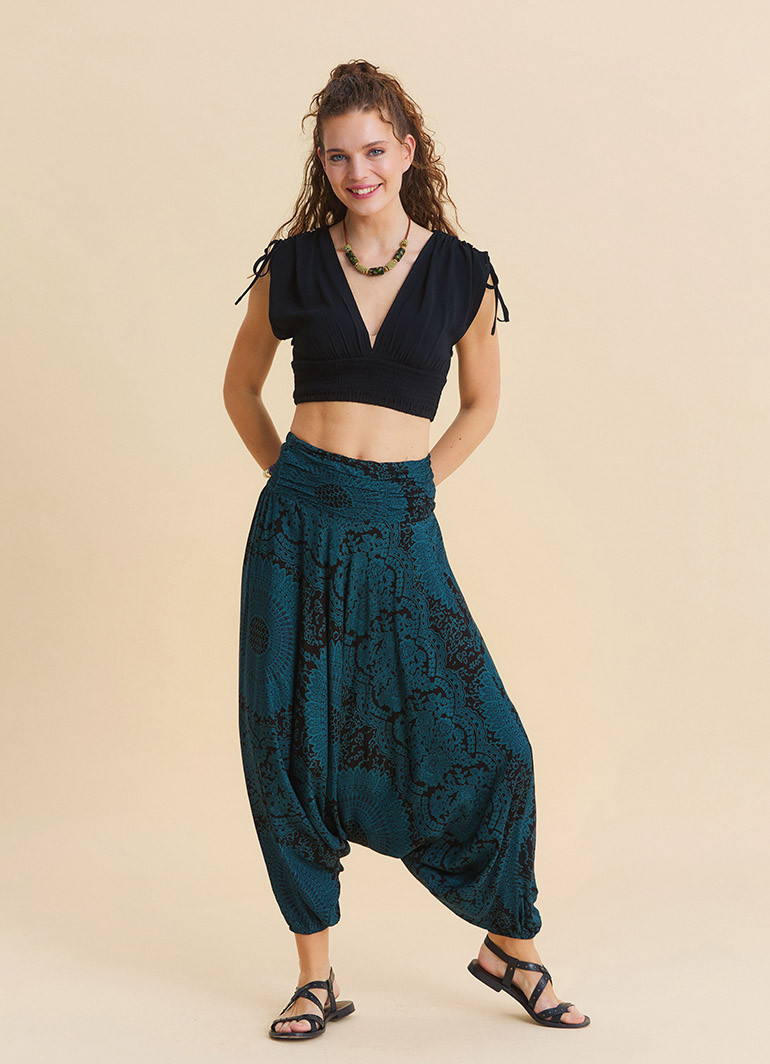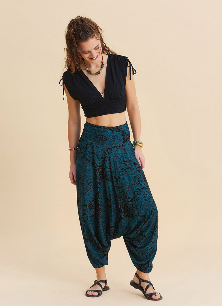 For those who want to move freely all day long: the draped waistband, elastic-hem petrol yoga pants combine effortless comfort with a refined, modern silhouette—perfect for both home and everyday wear.