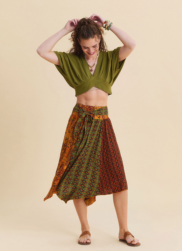 Made from 100% woven viscose, the fabric feels soft and breathable against the skin. Woven from natural cellulose fibers derived from beech trees, it contains no polyester, helping keep you cool and comfortable during warm weather. It pairs effortlessly with sandals, crop tops, basic t-shirts, or ethnic-inspired pieces.
