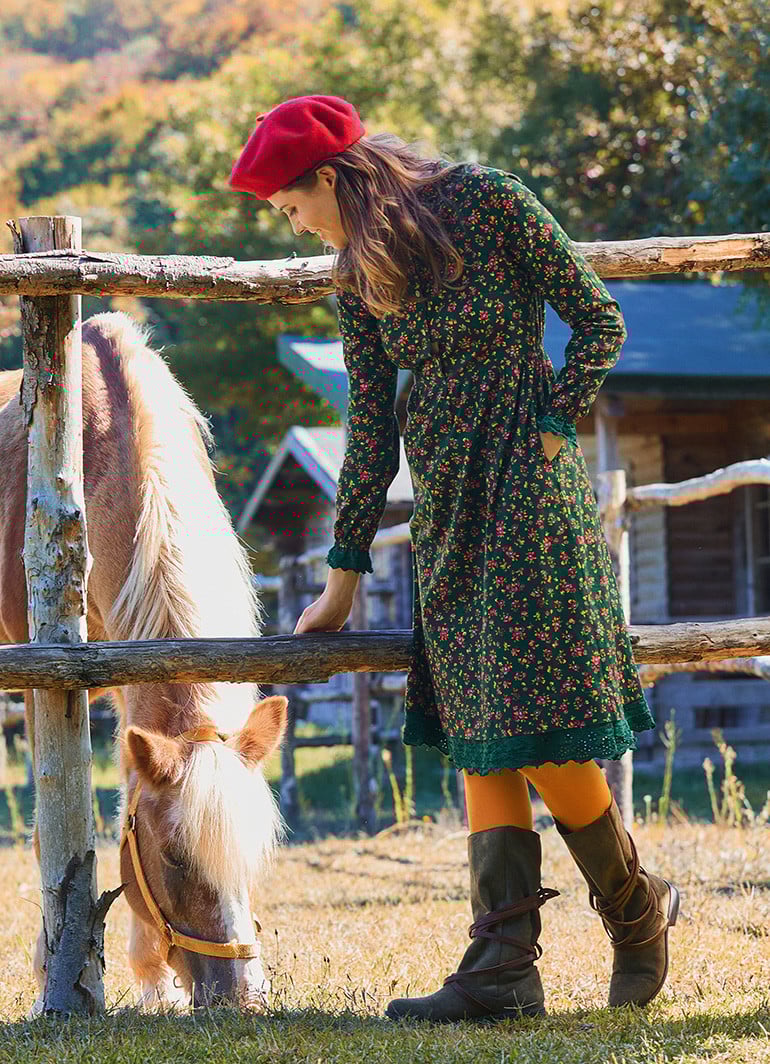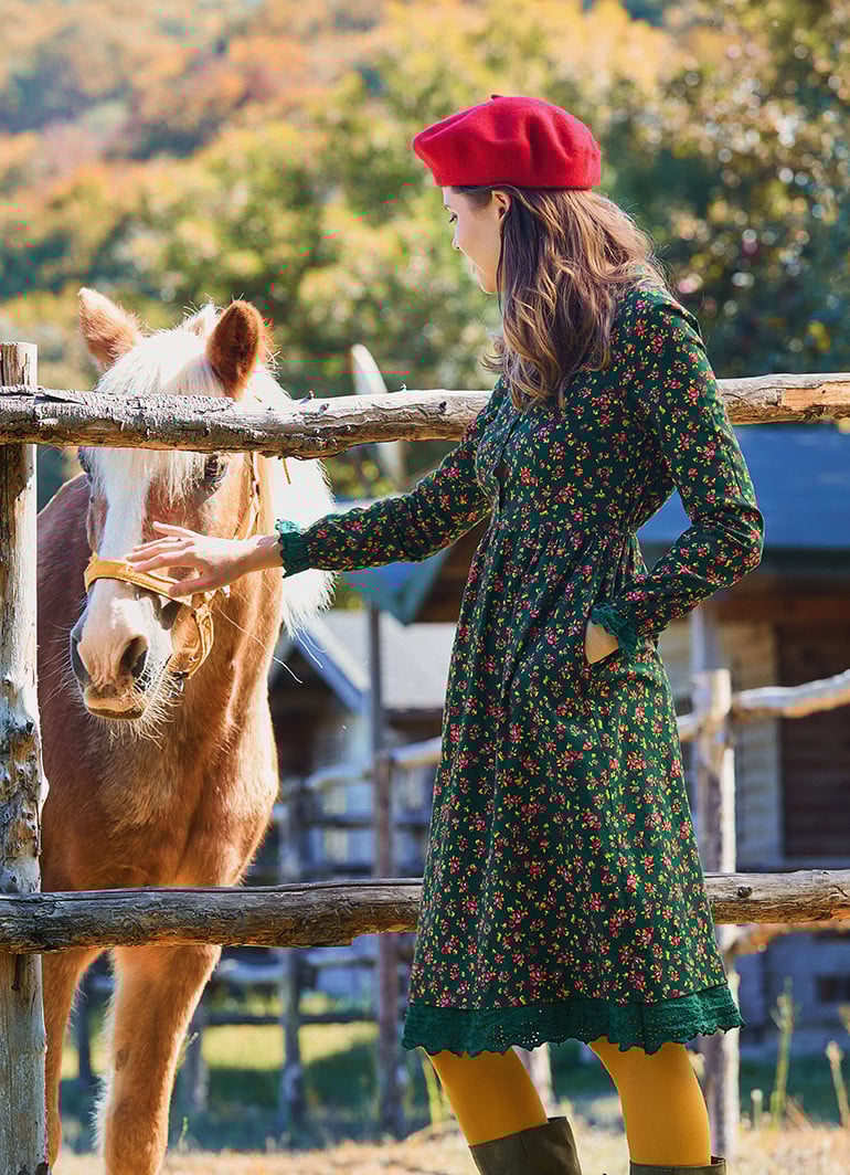 Step into effortless elegance with the Grandad Collar Elastic Waist Lace Green Floral Dress 4730. Its classic grandad collar paired with delicate lace detailing creates a timeless, feminine look perfect for any winter wardrobe.