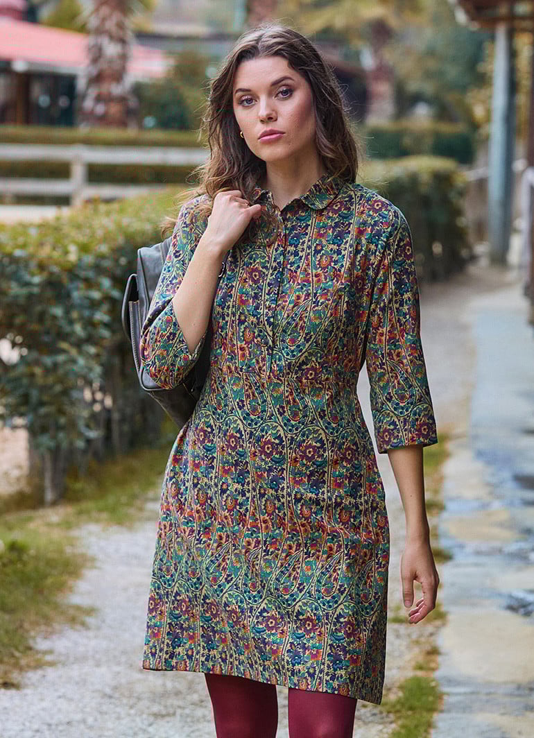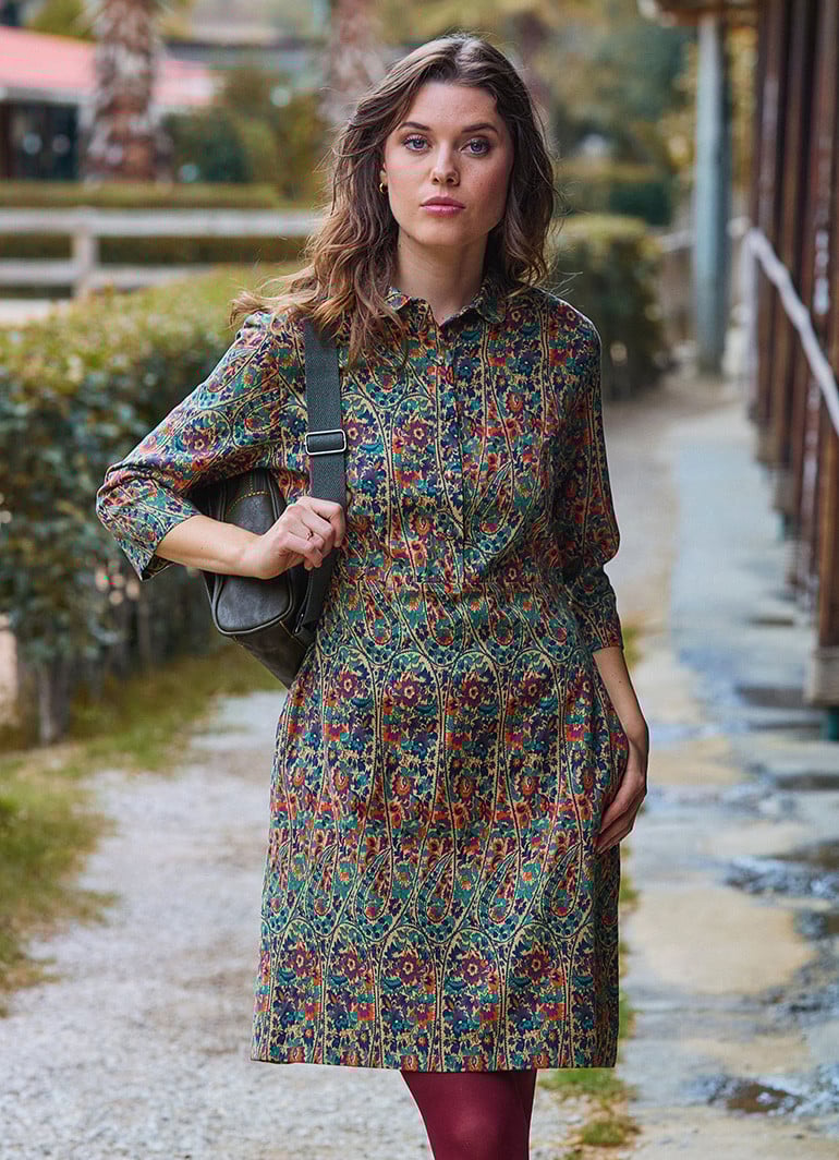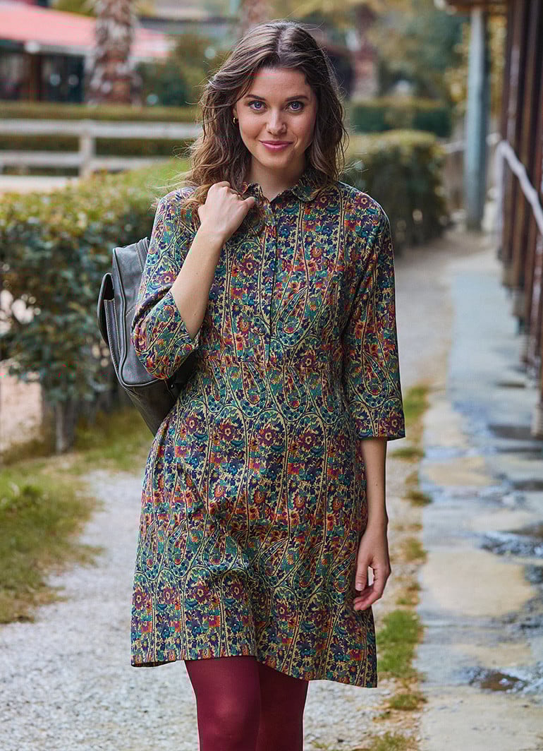 The shirt collar and neat button placket lend a tailored, shirt-dress aesthetic, while the long sleeves and ethnic-inspired floral pattern keep the design warm and seasonally appropriate. Thoughtful tailoring creates gentle waist definition without restricting movement, delivering comfort and flattering lines.