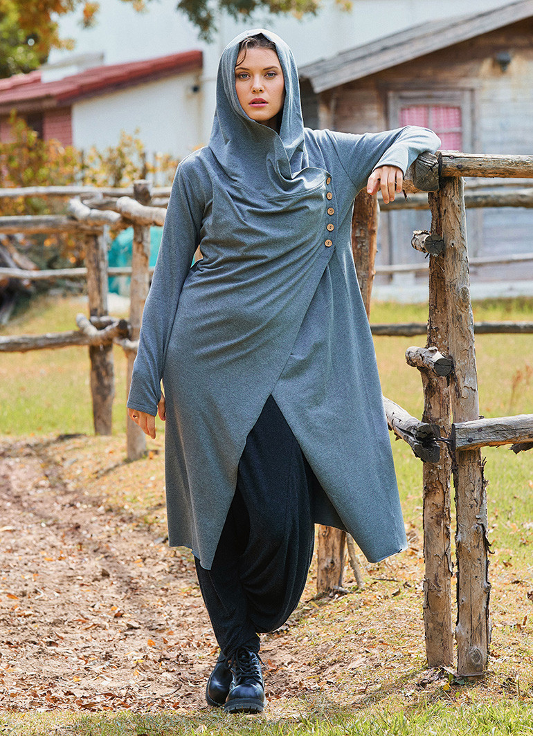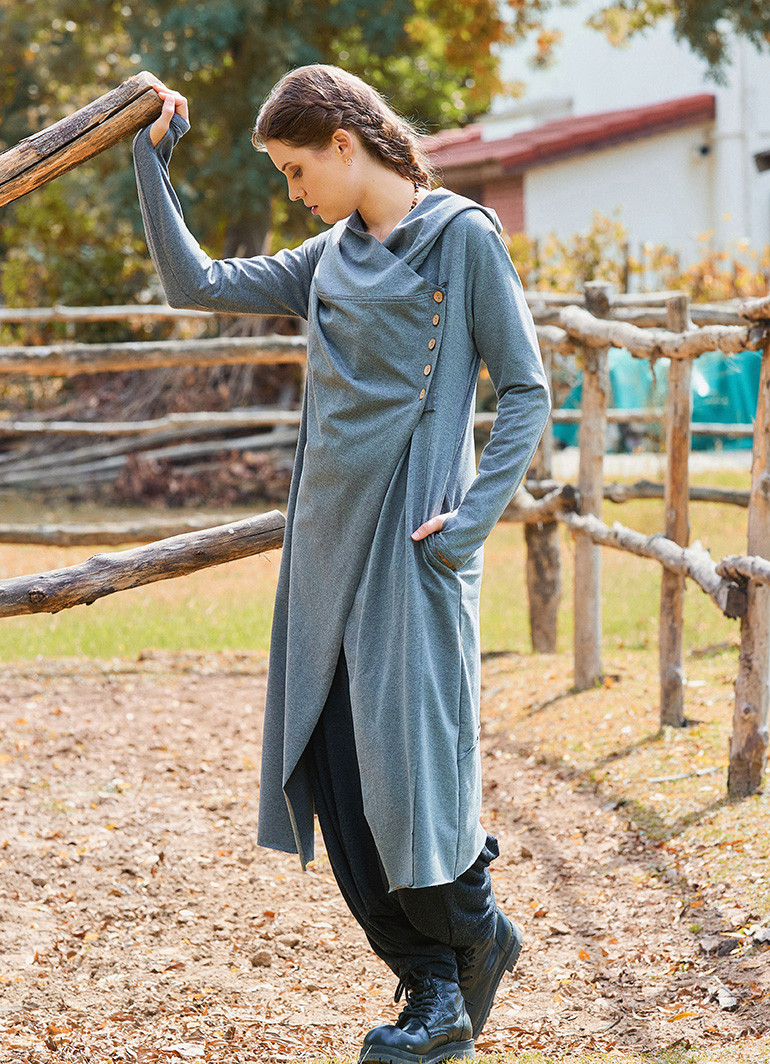 Meet your new go-to layering piece: the Hooded Gray Bohemian Cardigan with Thumbhole Button Detail (4695). This longline cardigan blends classic boho charm with practical touches — a roomy hood, decorative button accents and thumbhole cuffs that keep sleeves in place and add a subtle, modern twist.