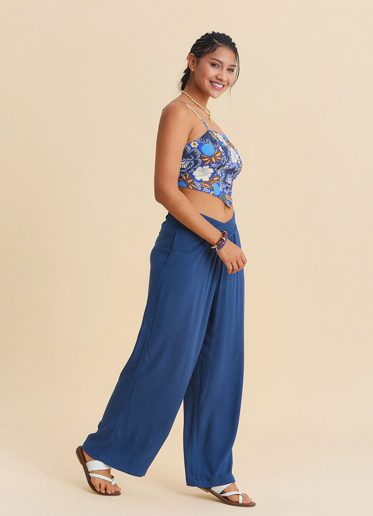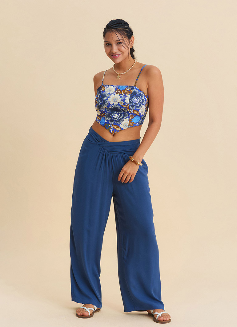 Designed with a wrap-style waist and a cross belt detail that flatters the silhouette, this indigo viscose trouser adds depth to your outfits and delivers easy “throw on and go” comfort for warm days.
