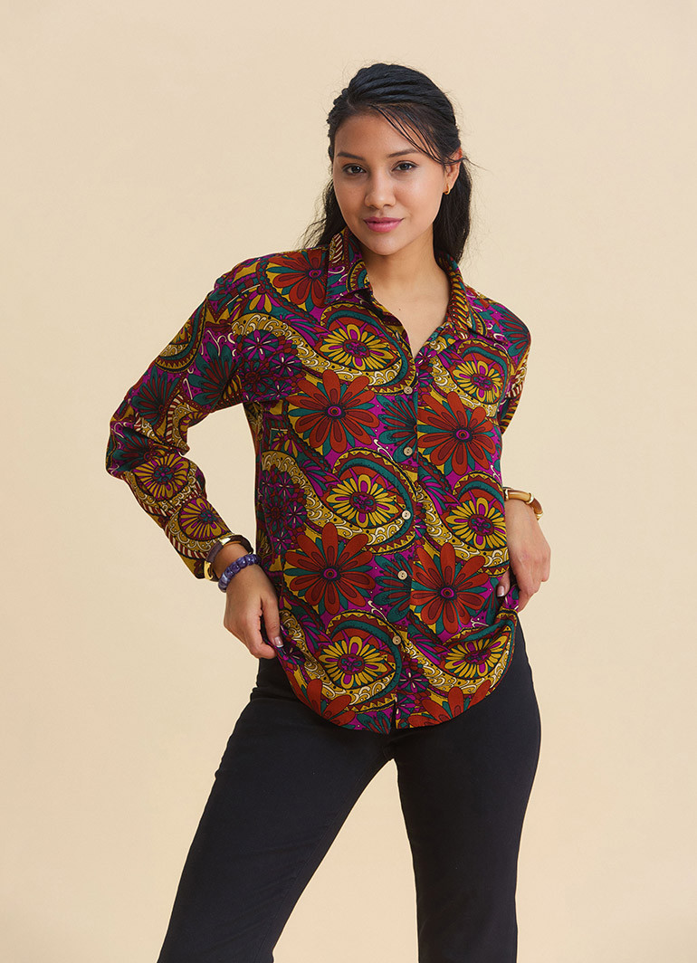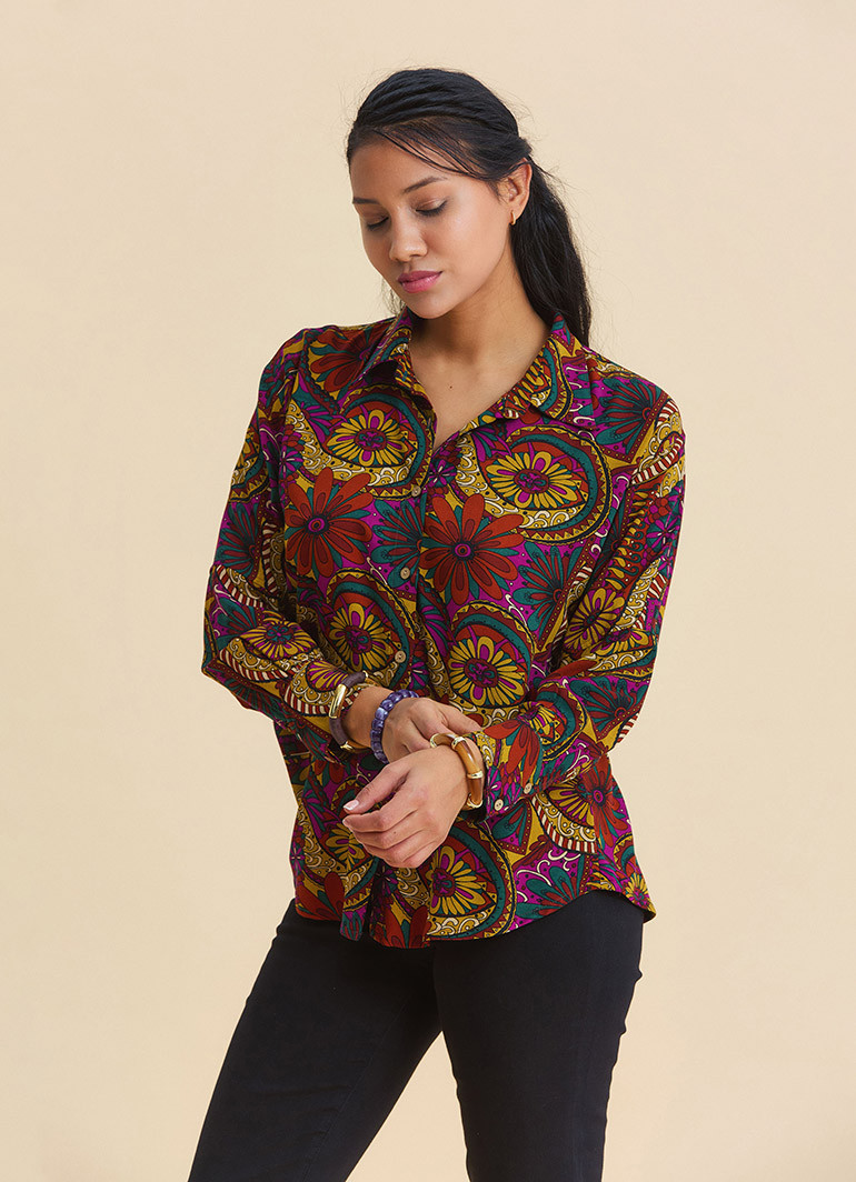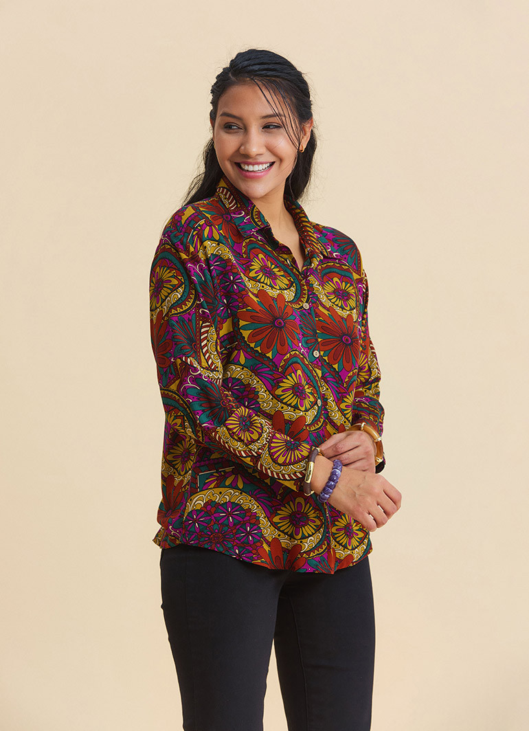 Featuring a classic shirt collar, button-down front, and eye-catching Mayorka pattern, this long sleeve blouse is a stylish choice for women who want to add a bohemian and ethnic touch to their everyday outfits. Its lightweight structure offers all-day comfort while the fluid drape creates a relaxed yet elegant silhouette.