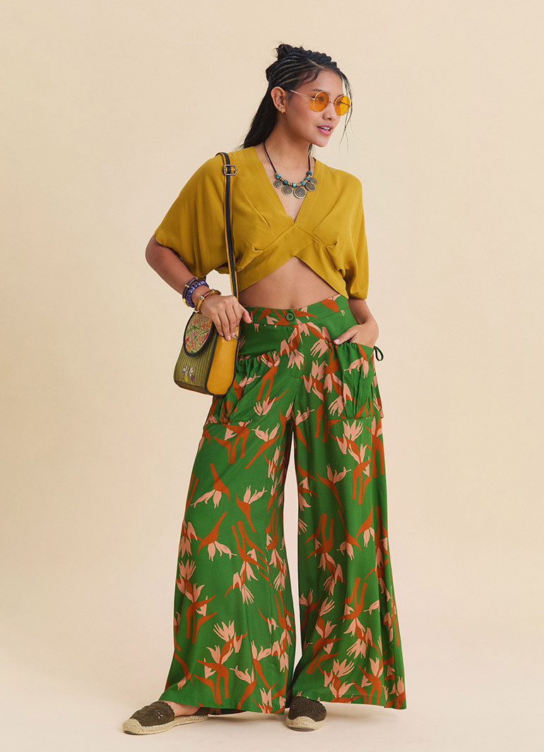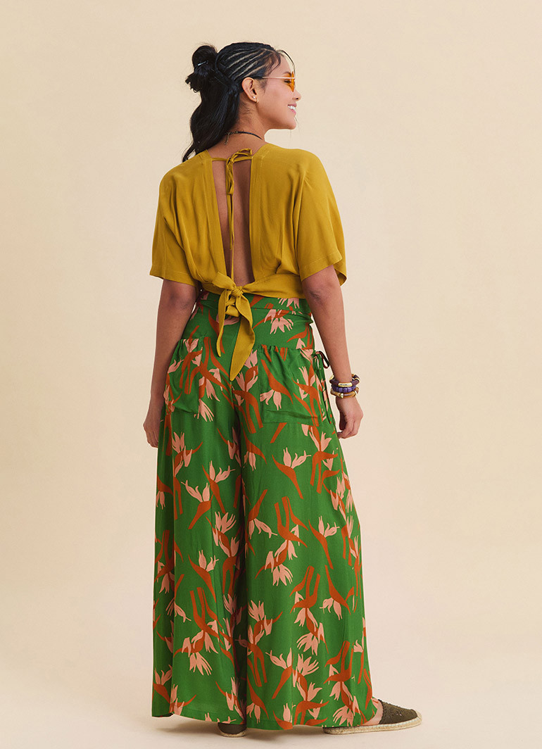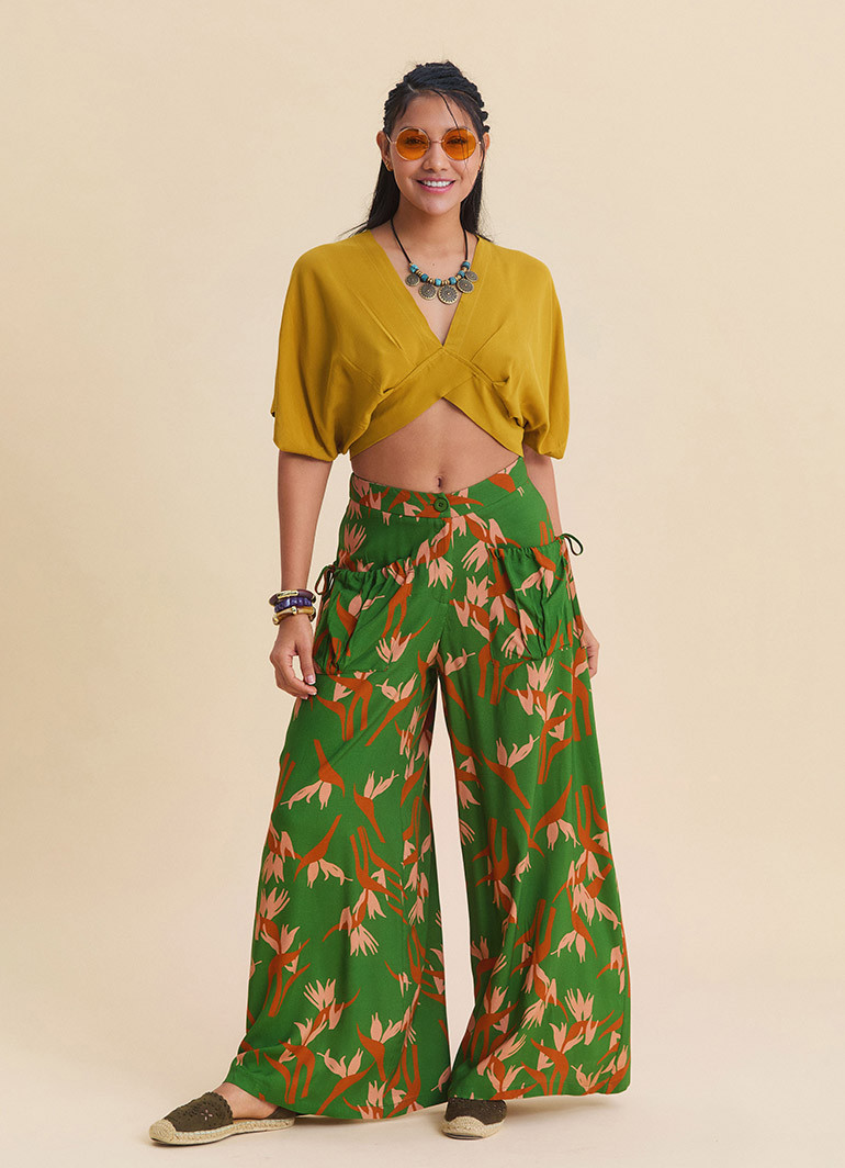 The drawstring waist detail makes waist adjustment practical, while the pocket design adds functionality for everyday use. The wide-leg form creates a free silhouette that perfectly matches a bohemian/authentic style.