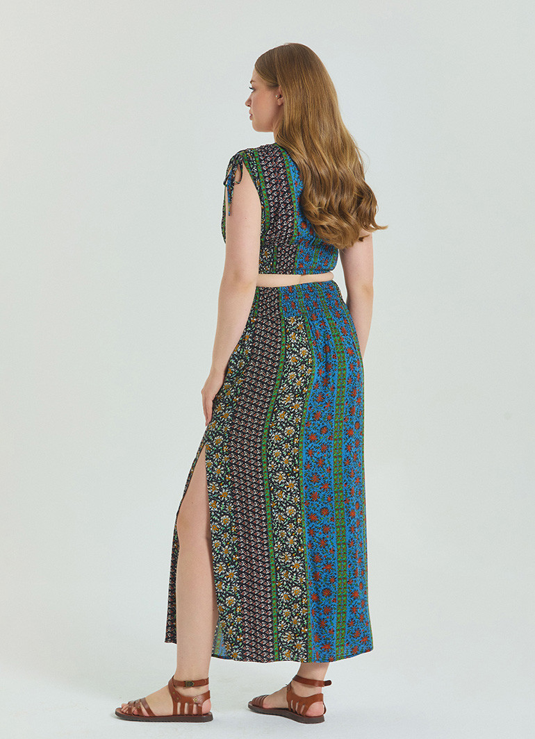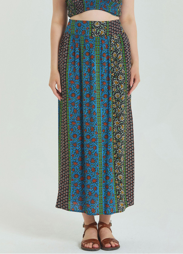The rich navy hue is brought to life with a delicate floral print, while the deep side slit adds a hint of allure and unrestricted movement. A flexible back elastic waistband ensures a snug yet comfortable fit, expanding up to 86 cm without compromising on shape.