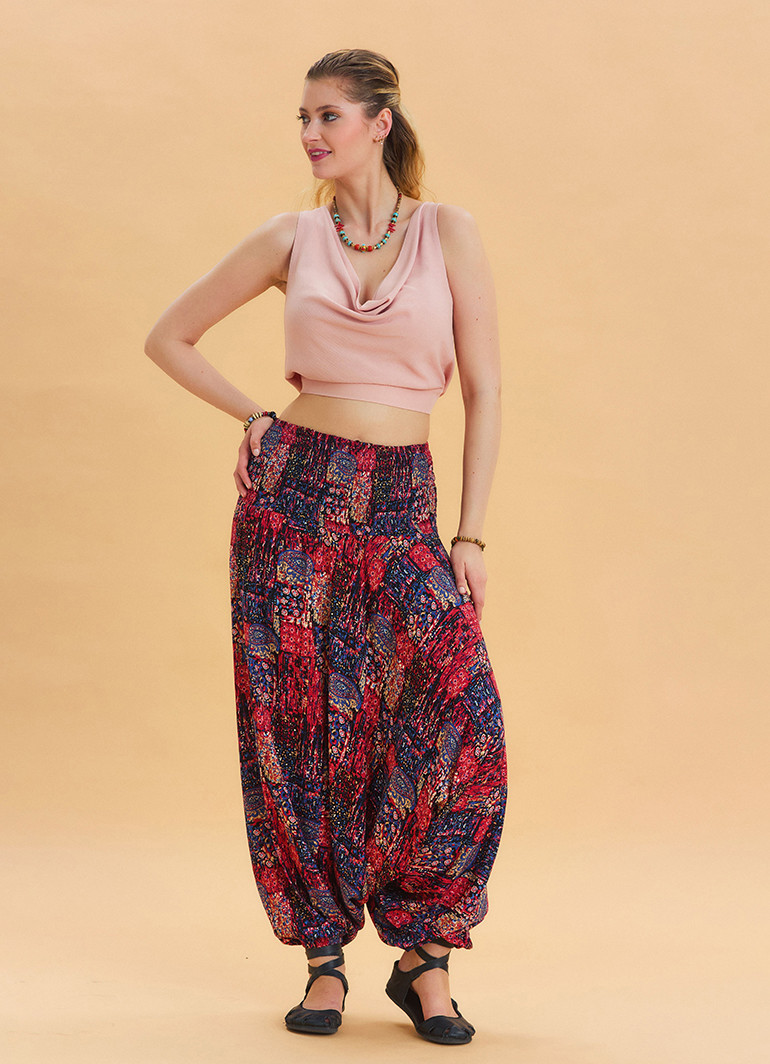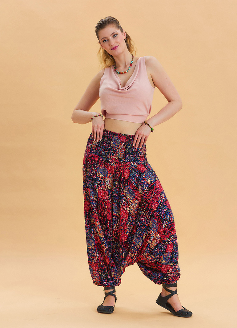 Step into bohemian elegance with our Red Bohemian Shalwar with Elastic Waist and Gipe Detail 4536. This stunning piece features a vibrant red pattern enhanced by intricate gipe detailing at the waist, making it a standout addition to your wardrobe.