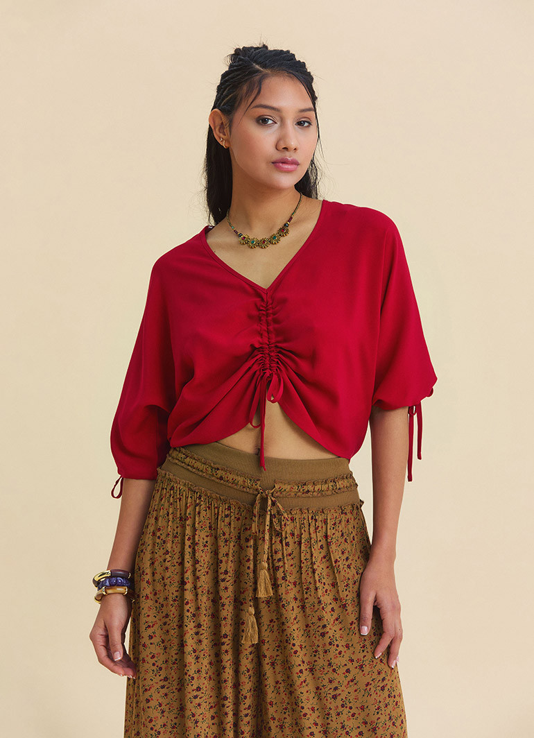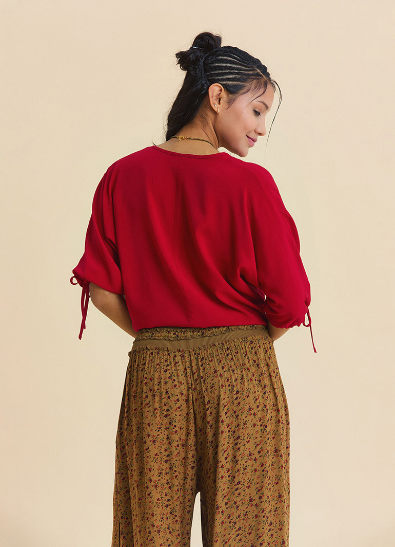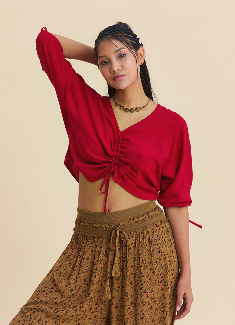 The boat neck half-sleeve ruched red summer blouse is an ideal choice for women who want to create a look that is both comfortable and eye-catching in warm weather. Its vibrant red color offers an energetic appearance, while the cropped cut adds a modern and dynamic touch.