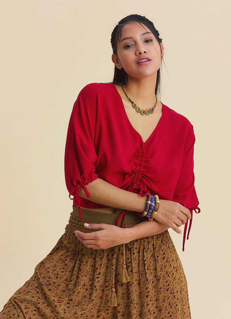 This red summer women’s blouse can easily be paired with shorts, skirts, jeans, or high-waisted trousers, making it a strong staple for the season’s wardrobe. Discover this model now, offering both elegance and comfort together.