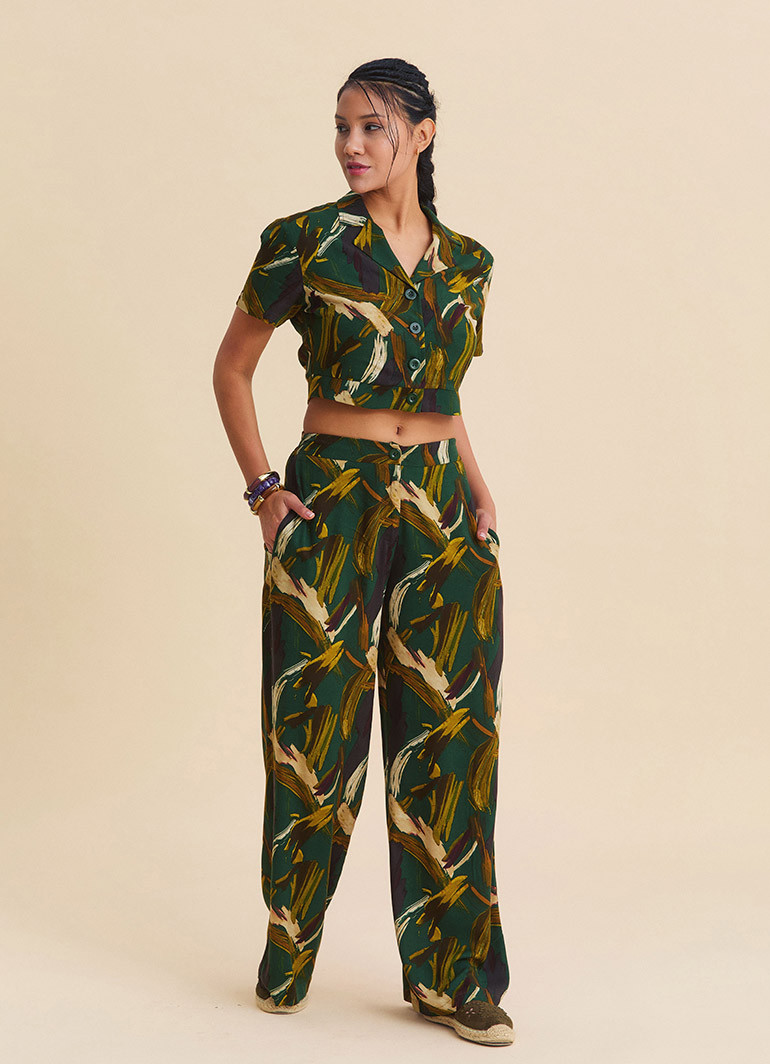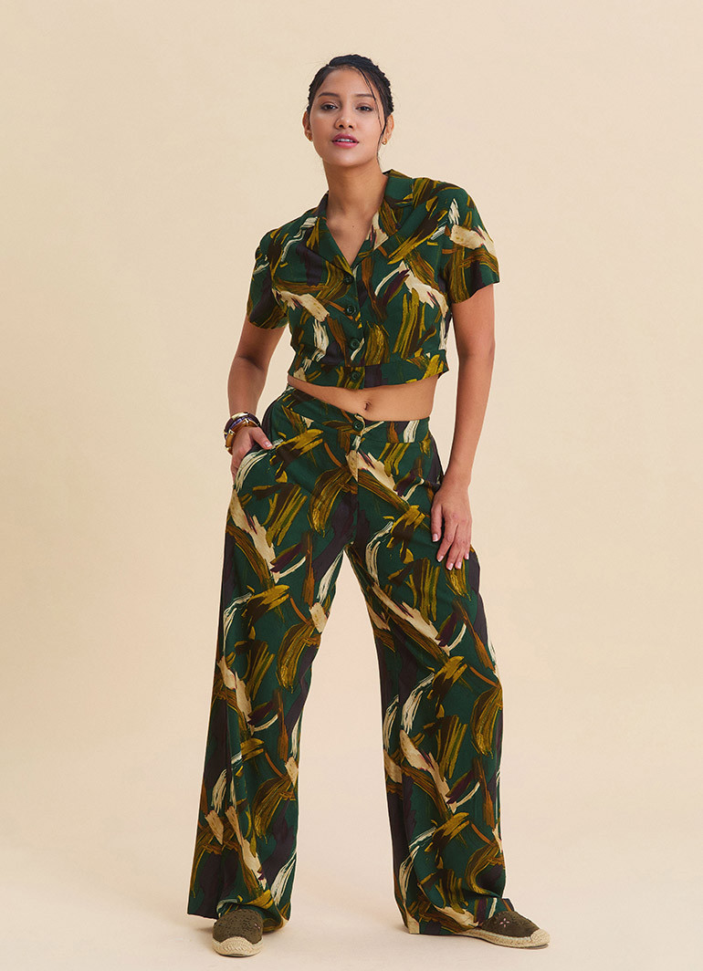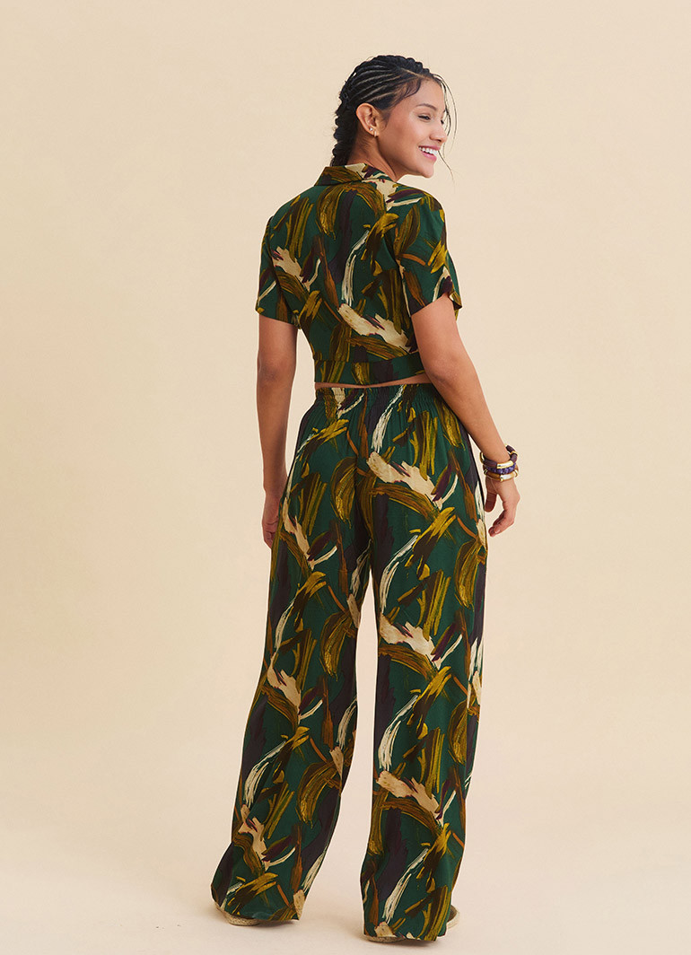 Crafted from 100% woven viscose, these women’s palazzo pants offer a lightweight and breathable feel, making them ideal for warmer days. The polyester-free fabric ensures skin-friendly comfort, while the flowy structure enhances freedom of movement. The mid-rise waist and front button detail add a clean yet refined touch to the overall design.