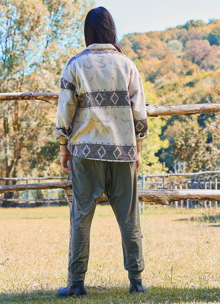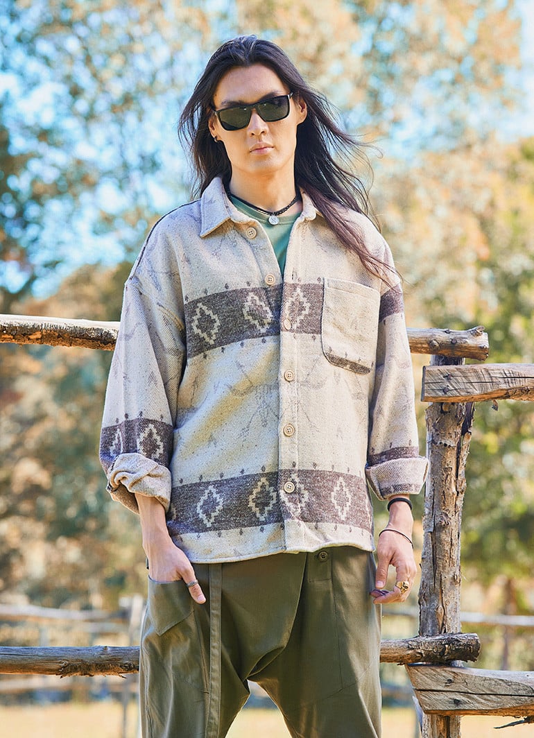 Thoughtful tailoring and a roomy cut make it ideal for casual weekends, city strolls, or relaxed office styles. The patterned design reads as artisanal and modern at the same time — pair it with slim chinos or straight denim to balance the relaxed shape.