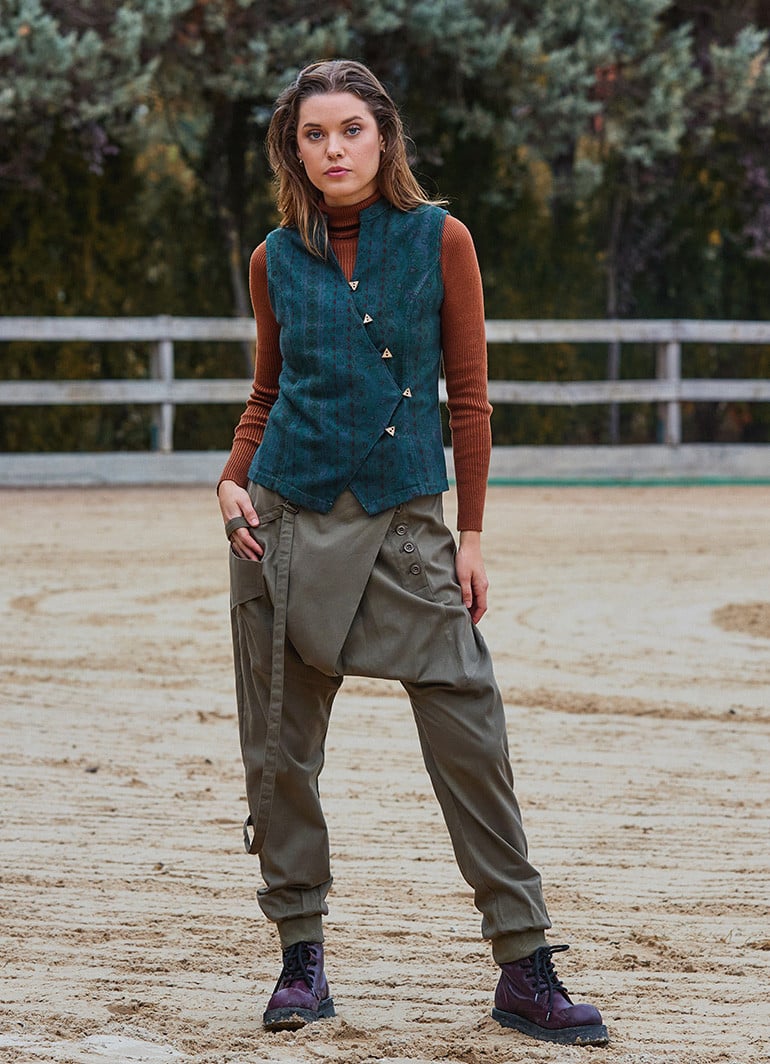 Expertly crafted from 100% woven cotton, these shalwar trousers are designed to keep you cool and sweat-free, making them ideal for the summer season. The elegant earth-tone fabric is beautifully accented with rope detailing and button lace features, delivering a unique bohemian aesthetic that complements any wardrobe.