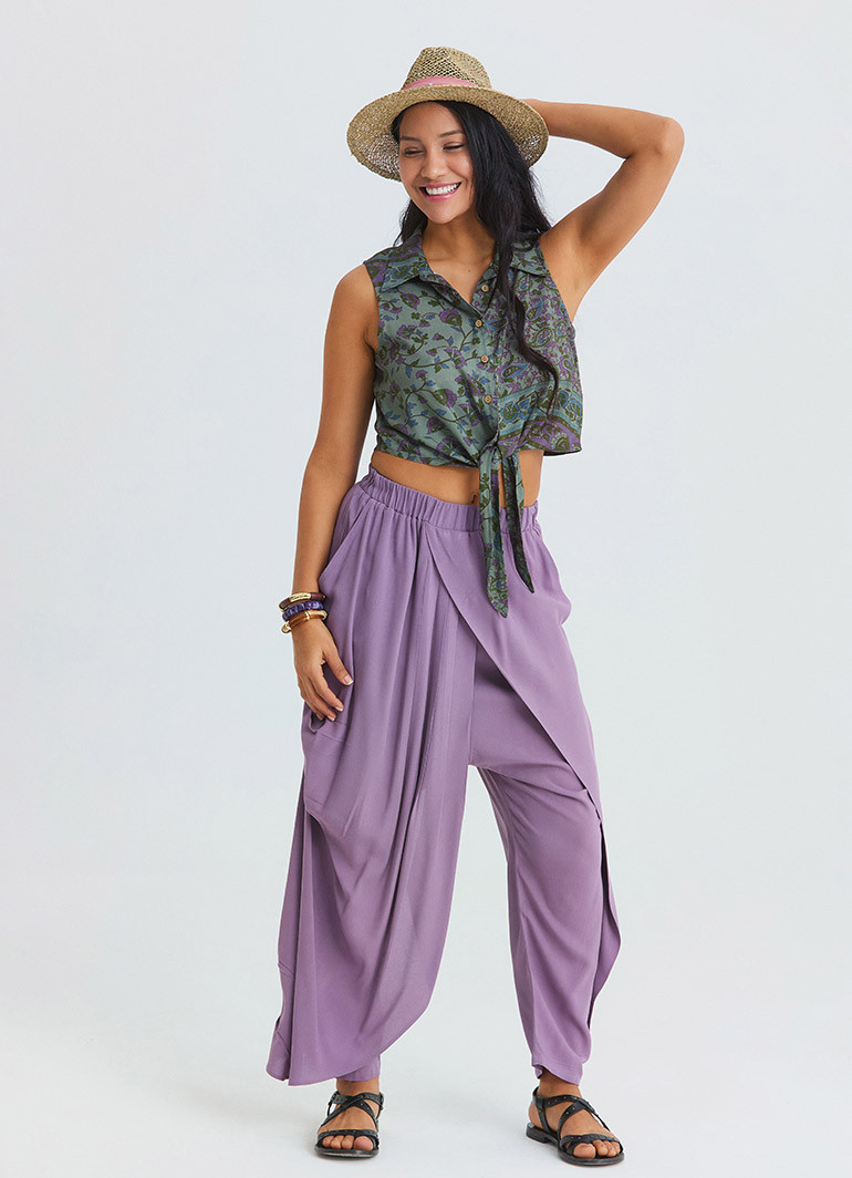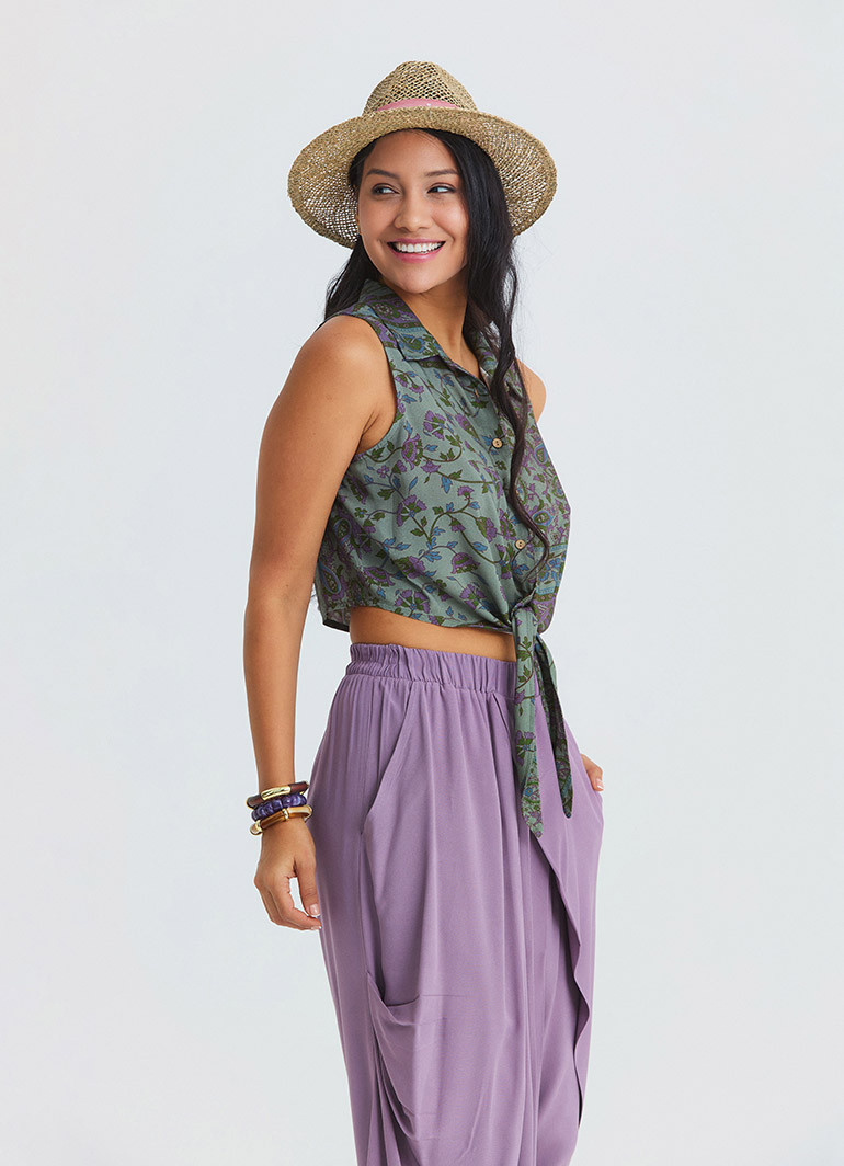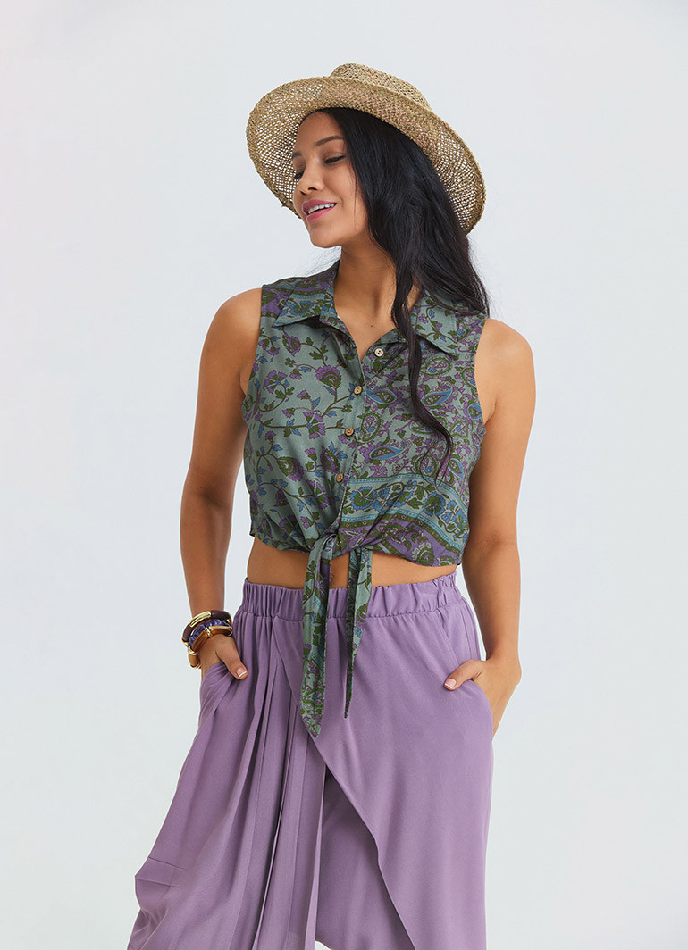 Standing out with its shirt collar detail and asymmetric cut, the Agora Crop Blouse 7293 adds a light, modern, and eye-catching touch to summer style. Its sleeveless design offers cool comfort on warm days, while the crop form brings a strong character to bohemian and ethnic outfits.