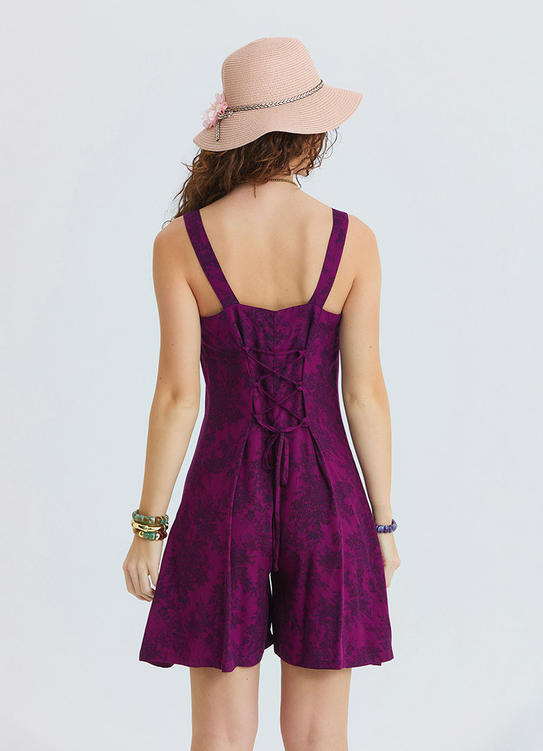 The front button details and thin straps add a delicate touch, while the open-back design brings a modern and feminine character to the look. The short playsuit design allows comfortable movement and makes it an ideal choice for relaxed summer styling.