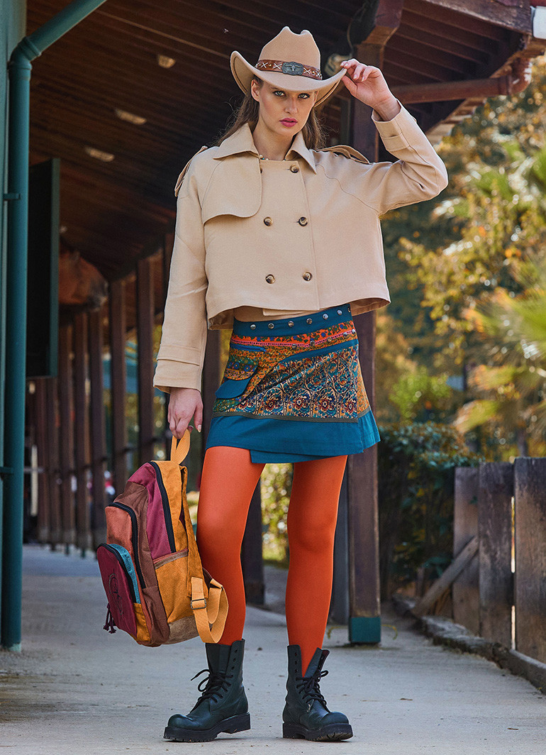 Featuring a flattering wrap silhouette secured with snap closures, this skirt brings together functional fashion and feminine flair. The petrol floral patchwork design lends a striking, artisanal feel, while its lightweight cotton fabric ensures breathability and all-day ease—even on warmer days.