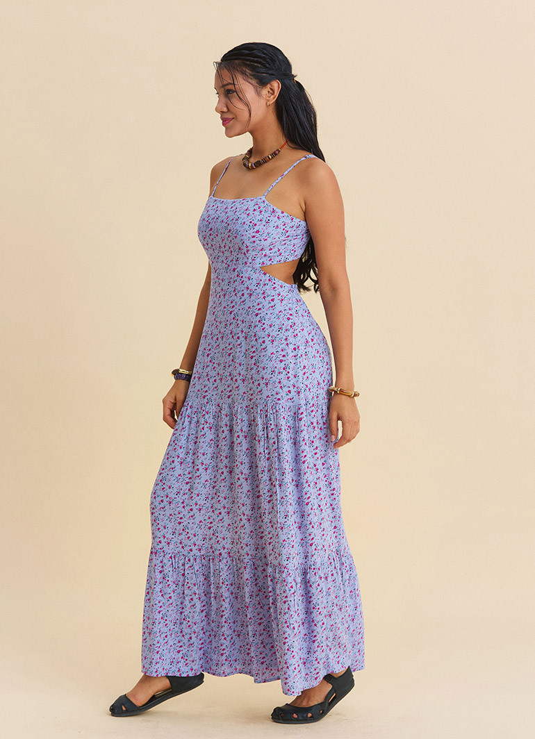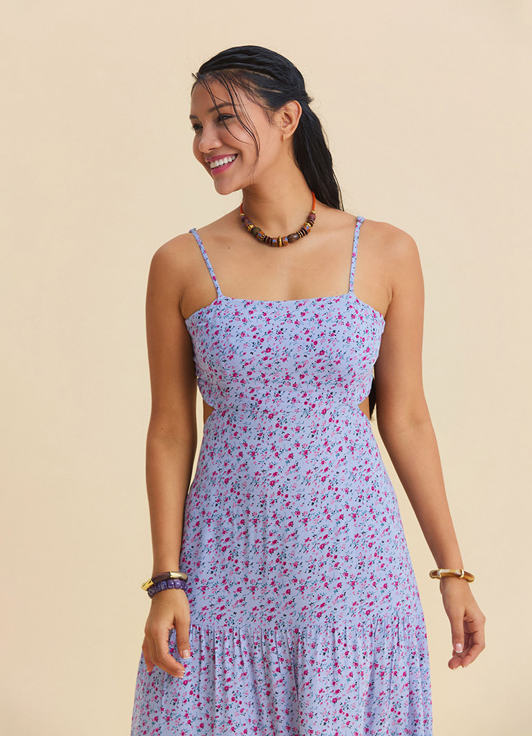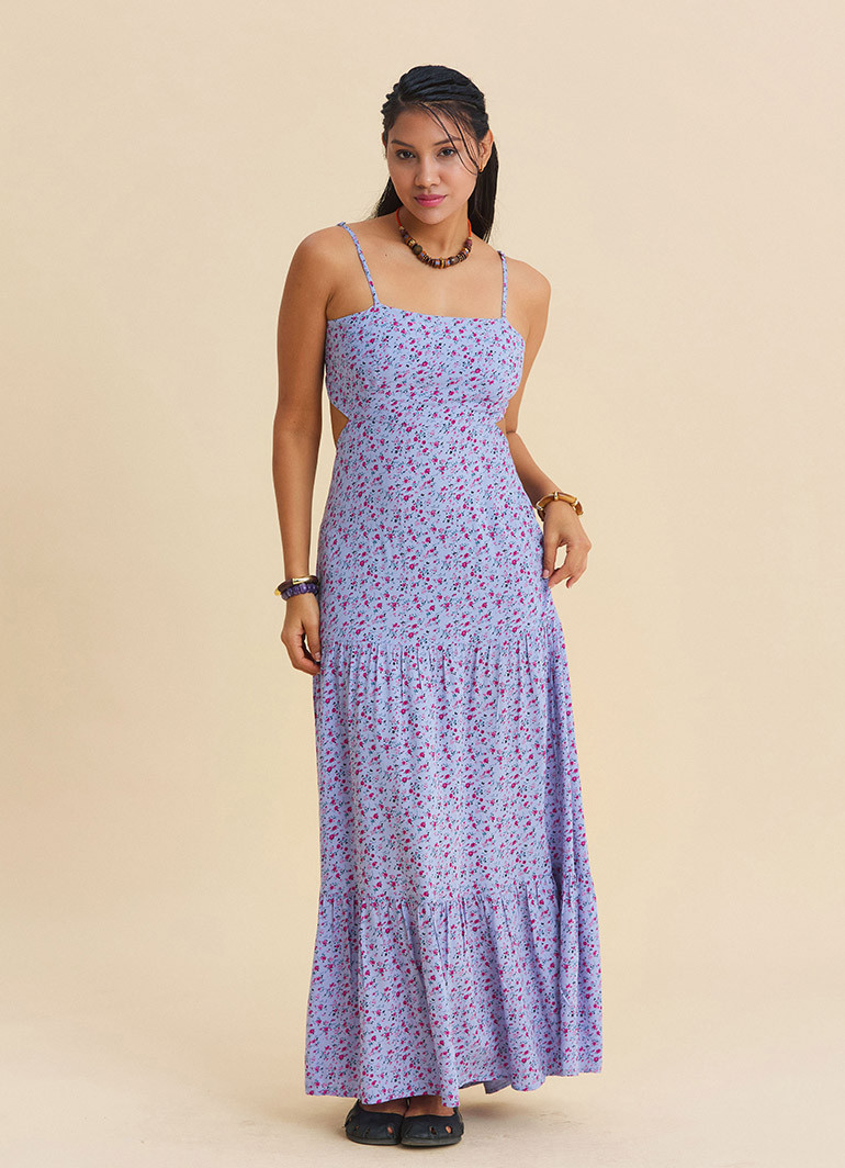 Capture the freshest, most romantic feel of summer in one piece: this lilac floral maxi dress with thin straps and an open-back detail offers all-day comfort with its lightweight, fluid viscose drape.