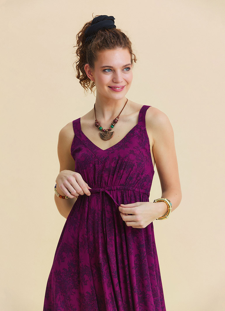 Its strappy design keeps you cool throughout the day, while the elastic structure adapts comfortably to the body. The wine-toned floral pattern pairs perfectly with sandals and natural accessories for a relaxed daytime look, and easily transforms into a more refined evening outfit with heels and minimal jewelry.
