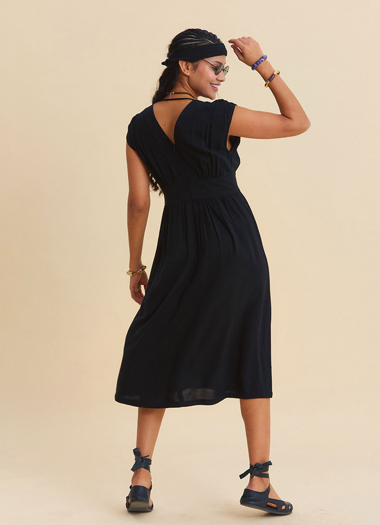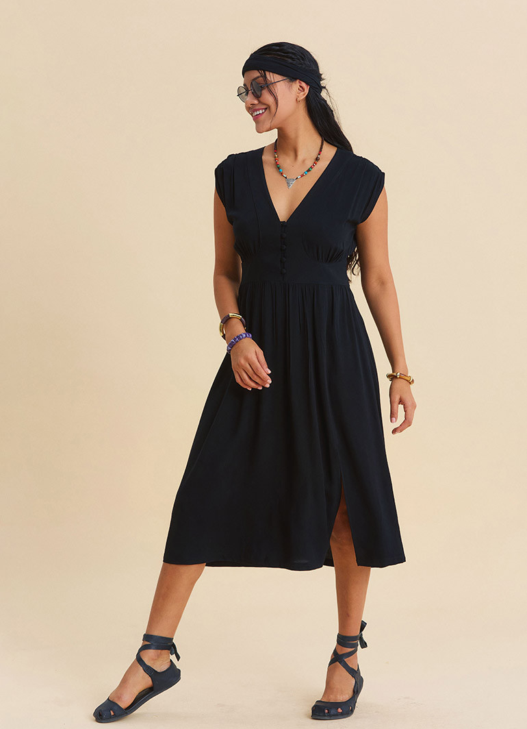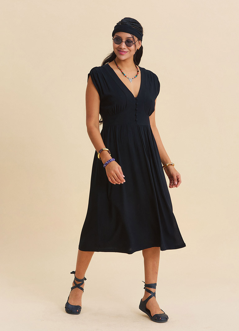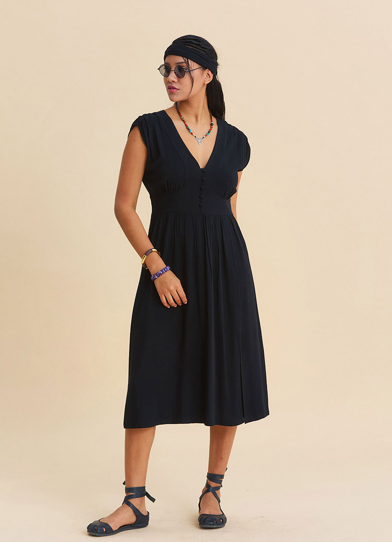 Crafted from 100% woven viscose derived from natural beechwood cellulose, this dress offers a breathable, ultra-light, and fluid texture that keeps you comfortable in warm weather. Free from polyester, it is an ideal choice for those seeking all-day freshness.