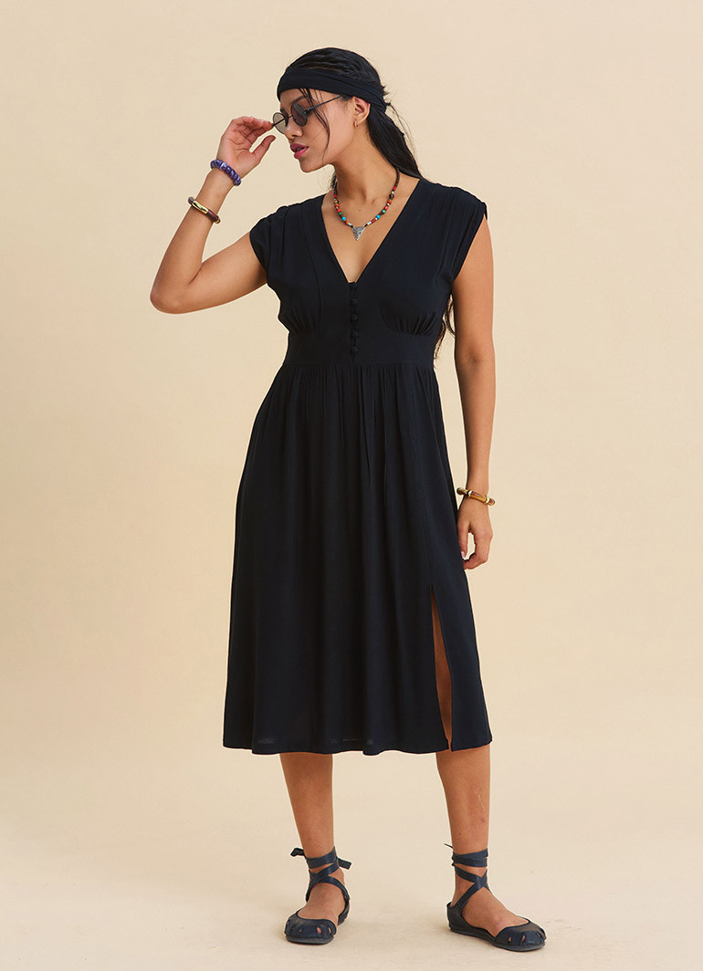 Effortless elegance for everyday wear: the V-Neck Backless Black Casual Dress 7124 combines the timeless appeal of black with the lightweight comfort of flowing viscose. Its midi length and slit detail create a silhouette that feels both comfortable and feminine.