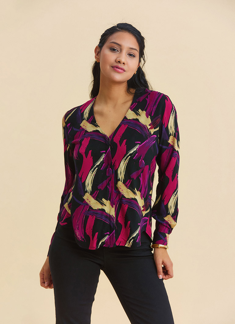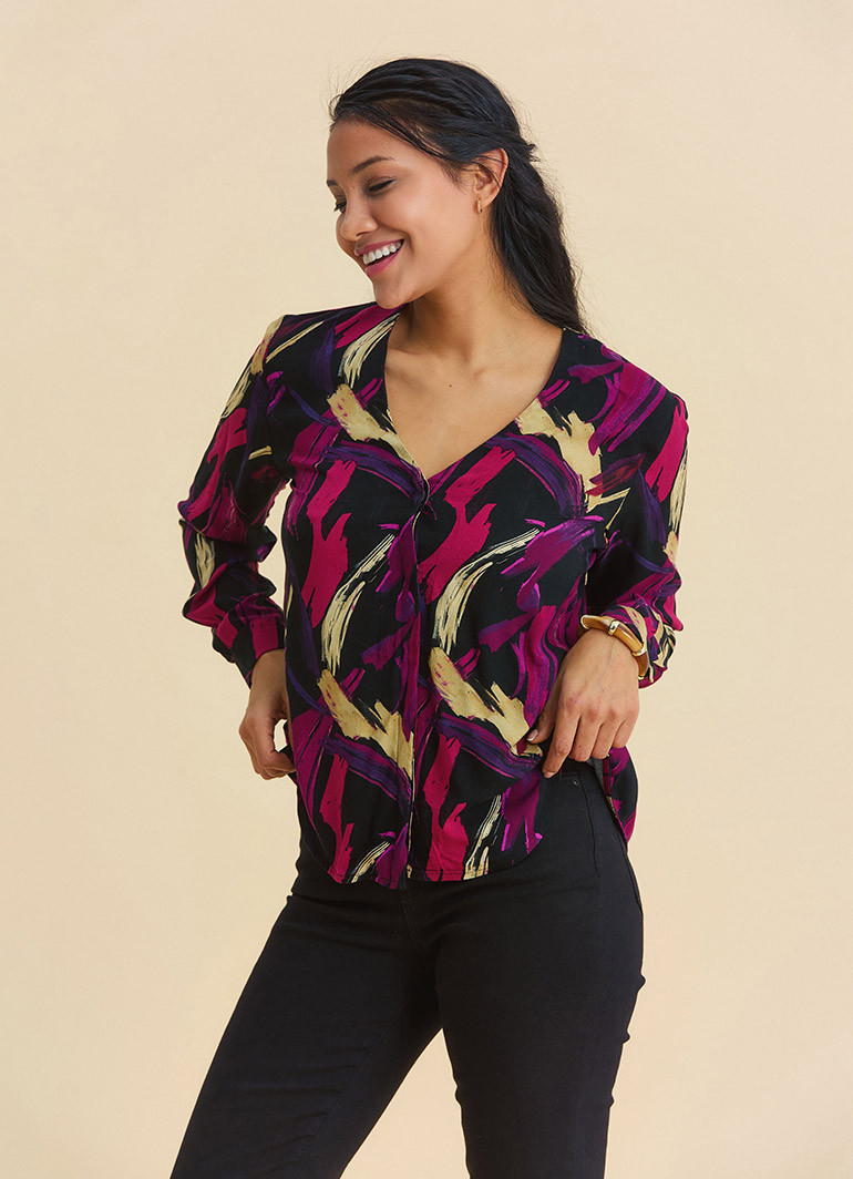 With its button-front design, long sleeves, and relaxed fit, this blouse can be styled effortlessly for both city looks and bohemian outfits. Pair it with jeans, tailored trousers, or skirts for an easy yet refined appearance.
