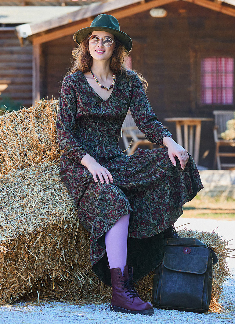 Crafted from 100% woven viscose sourced from beech cellulose, this khaki dress feels airy and breathable despite being winter-ready. The polyester-free fabric drapes naturally, resists overheating, and gives the silhouette a light, flattering flow that works well with boots or layered outerwear.