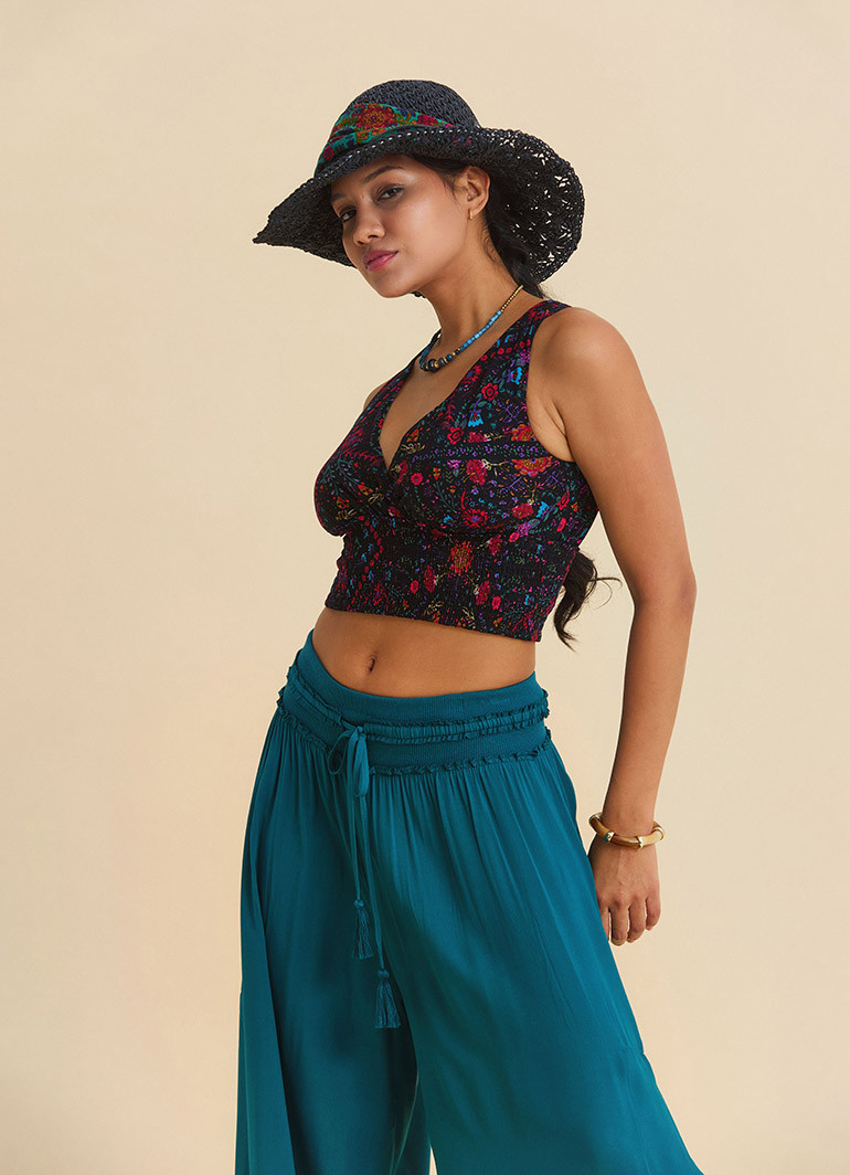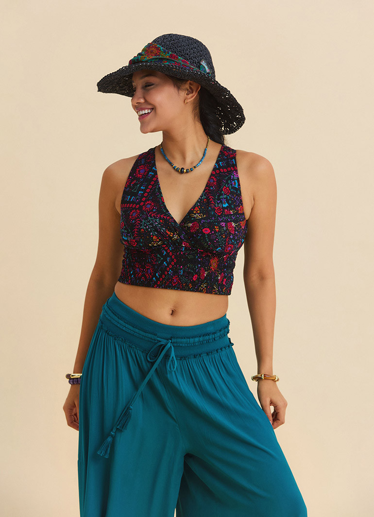 The V-Neck Smocked Back-Tie Black Floral Blouse 7256 is a standout piece designed for women who want to add lightness and elegance to their summer wardrobe. Its floral pattern creates a lively and feminine style, while the V-neck and adjustable back-tie detail add a delicate and stylish touch.