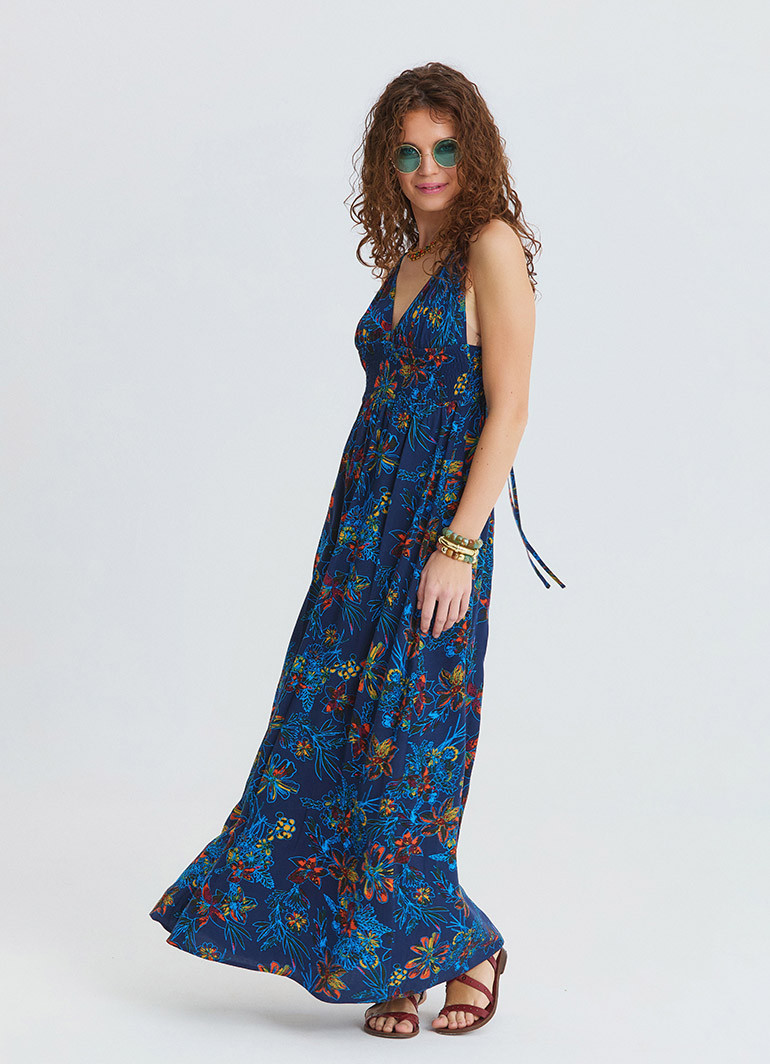Designed for effortless summer elegance, the V-Neck Smocked Indigo Floral Dress 7150 offers all-day comfort with its fluid viscose texture and bohemian spirit. The delicate shoulder straps create a light silhouette, while the V-neckline enhances a balanced and elongated look.
