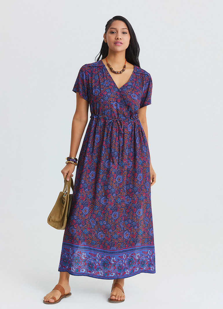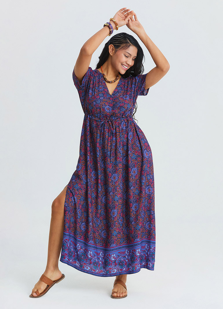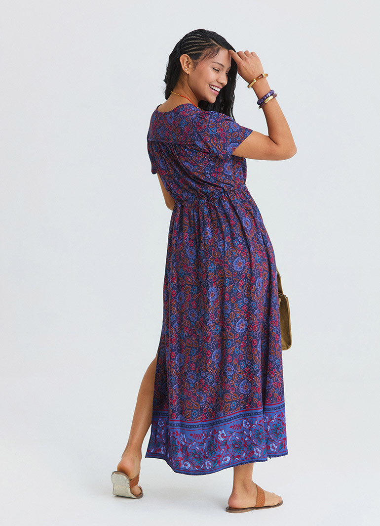 The floral pattern on a navy background gives the dress a vibrant and graceful appearance, while the V-neck cut and slit detail create a more dynamic and balanced silhouette. It can easily be styled with sandals and a straw bag for daily wear, or paired with natural accessories for a strong vacation look.