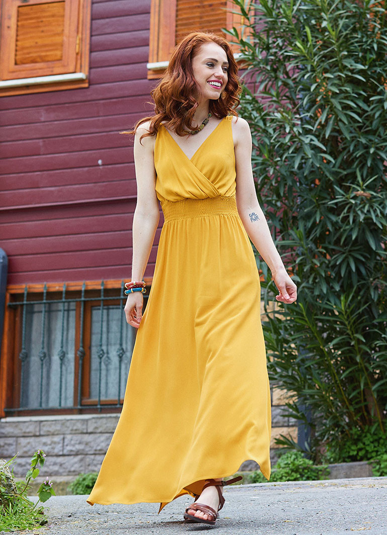 Easily styled with sandals, a straw bag, or minimal accessories, this mustard long summer dress will become a practical and eye-catching piece in your wardrobe. Discover it now to add a natural, comfortable, and stylish touch to your seasonal look.