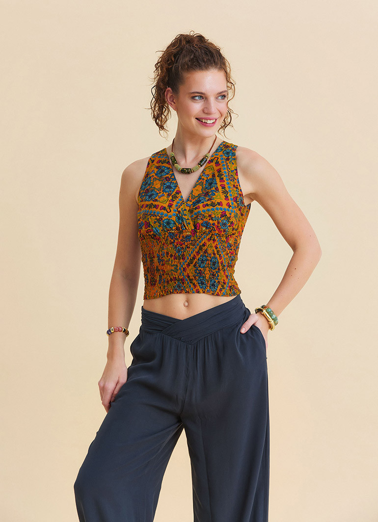 The V-Neck Shirred Back-Tie Mustard Floral Blouse 7255 is designed to bring a romantic and vibrant touch to your summer wardrobe. With its lightweight texture and eye-catching floral pattern on a mustard base, this blouse combines feminine elegance with a relaxed bohemian style, making it a standout piece for everyday outfits.