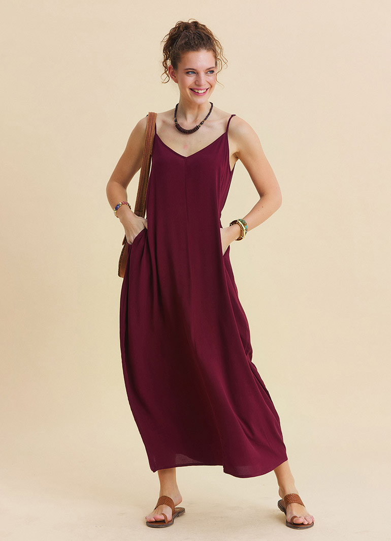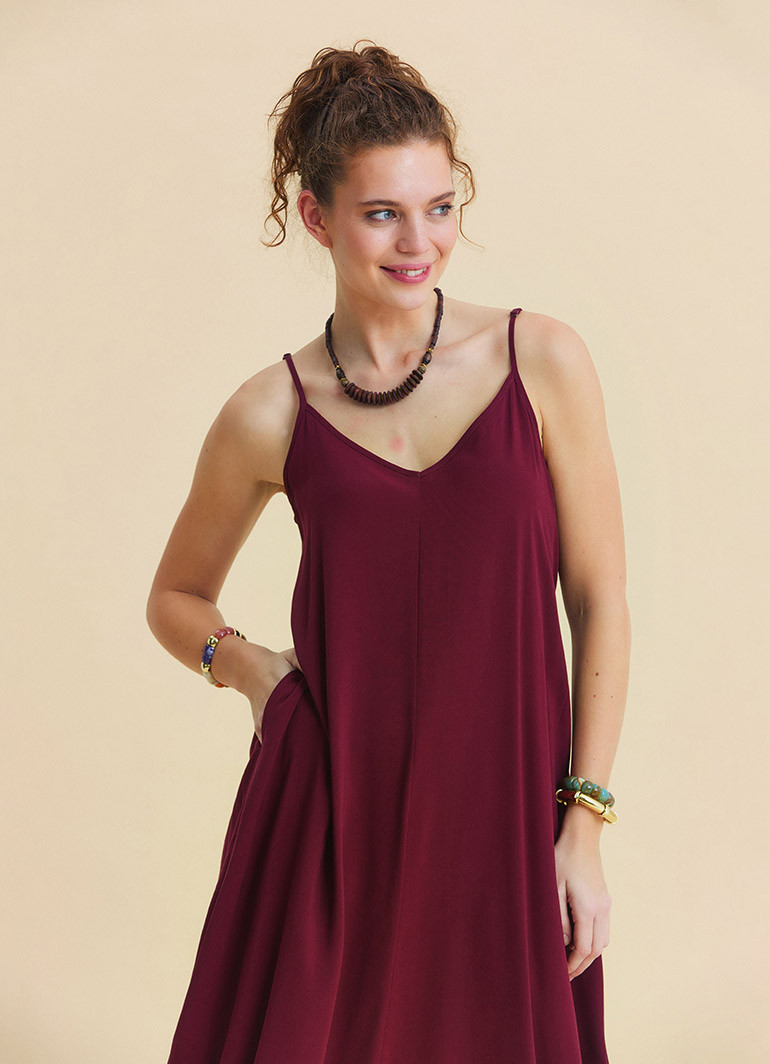 For those seeking effortless comfort in warm weather: this burgundy summer dress with a wide neckline and thin, adjustable straps elegantly highlights the shoulders while offering all-day ease with its bohemian silhouette and fluid drape.