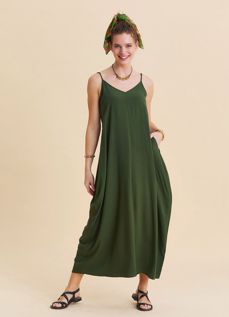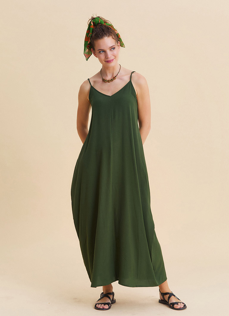 Designed to bring effortless comfort to summer days, the Wide Neck Thin Strap Khaki Long Dress 7143 delivers a flowing silhouette and relaxed bohemian elegance in one easy-to-wear piece.