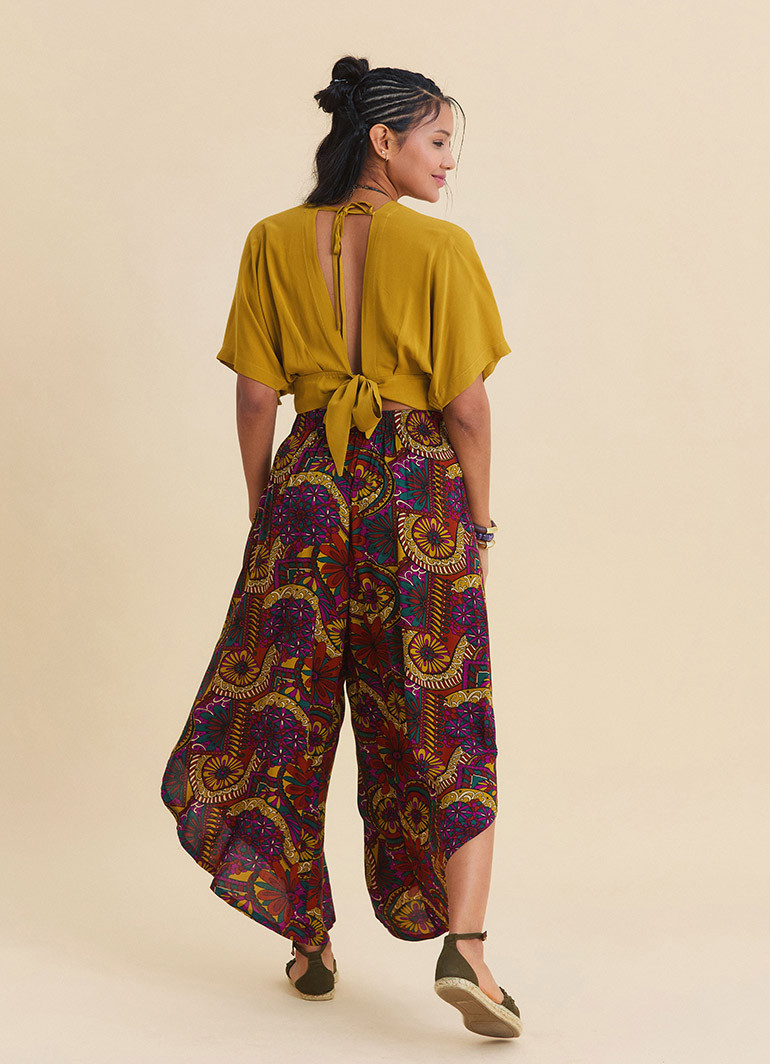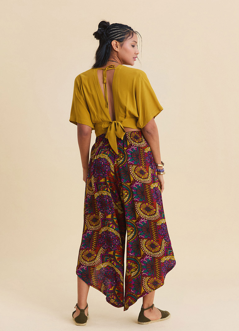 With its elastic waistband and asymmetrical cut, these patterned ethnic pants are designed for anyone who wants to move freely on warm summer days. The lightweight fabric creates a fluid drape as you walk, capturing the spirit of bohemian and ethnic style in one effortless piece.