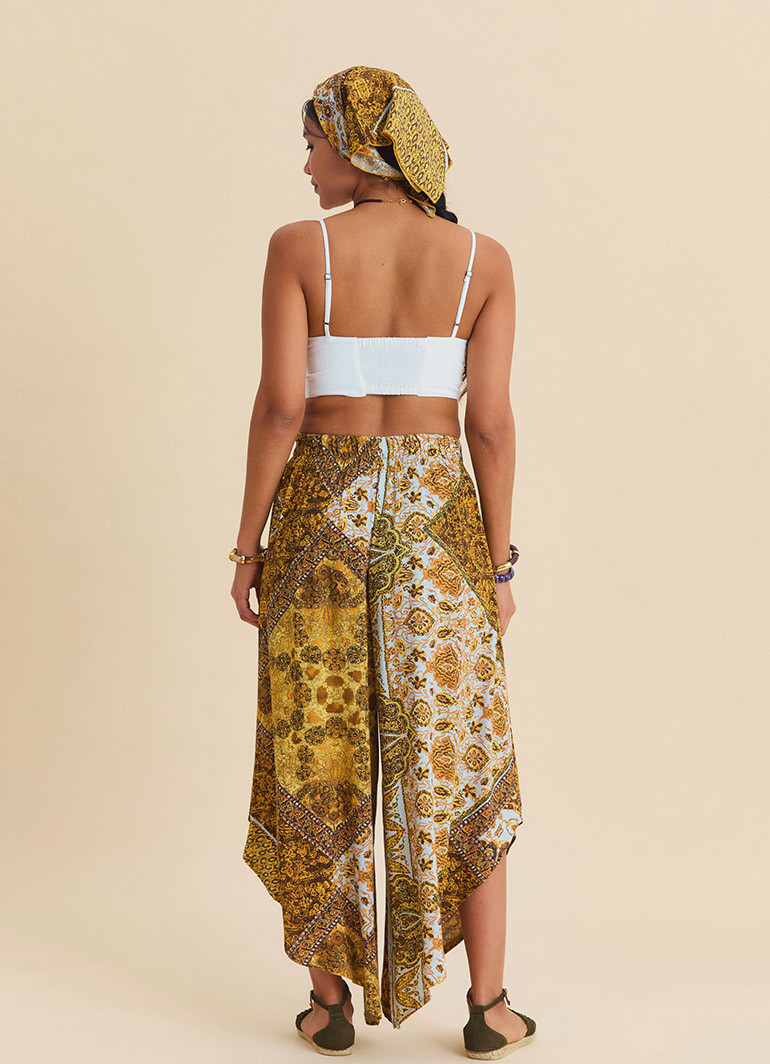 Radiating the energy of sunshine with its vibrant yellow tone and asymmetric cut, the Elastic Waist Asymmetric Cut Yellow Women’s Authentic Pants 7177 delivers both comfort and a bold bohemian statement for summer days.