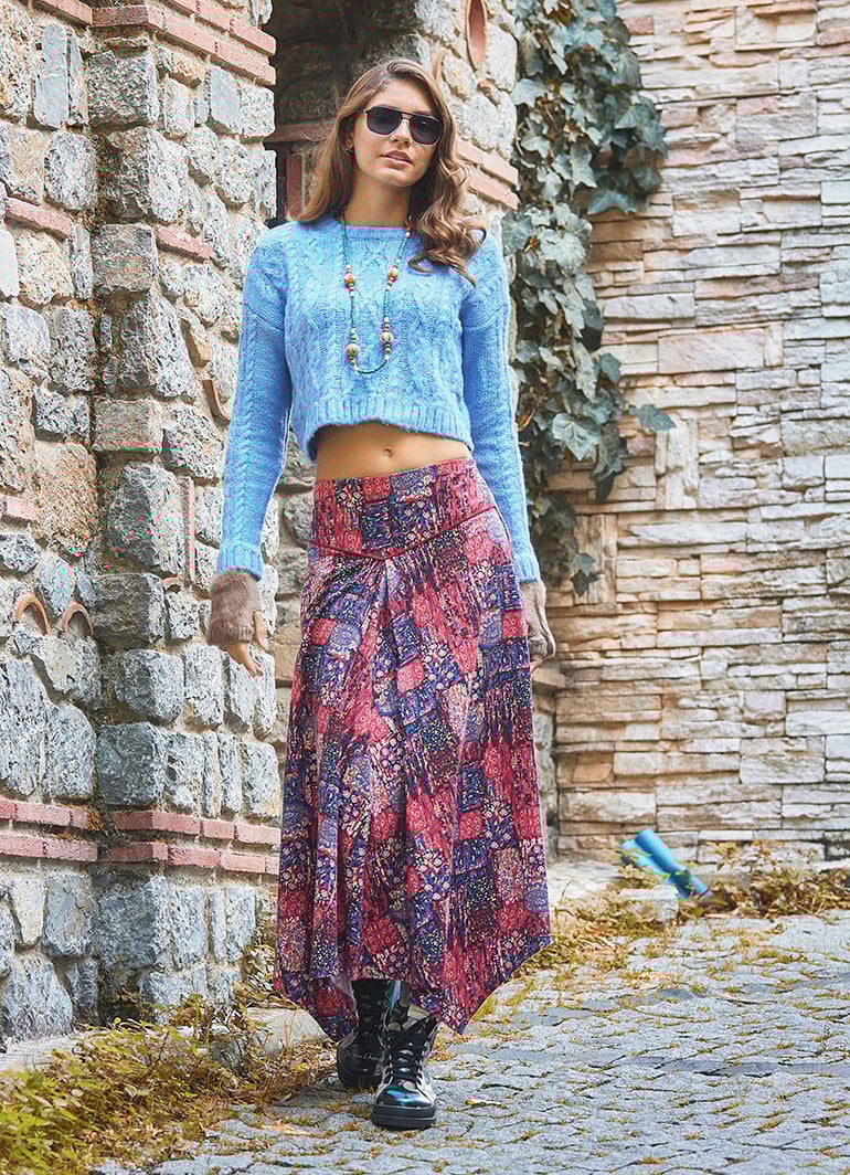Asymmetrical Hem, Binding Detailed Waistband, Flared, Midi Skirt