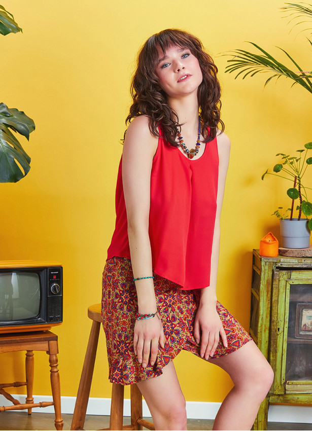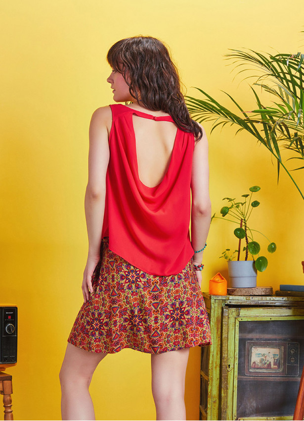 Inverted Pleat Detail, Pool Neck, Button Back Closure,Sleeveless, Backless Boho Top